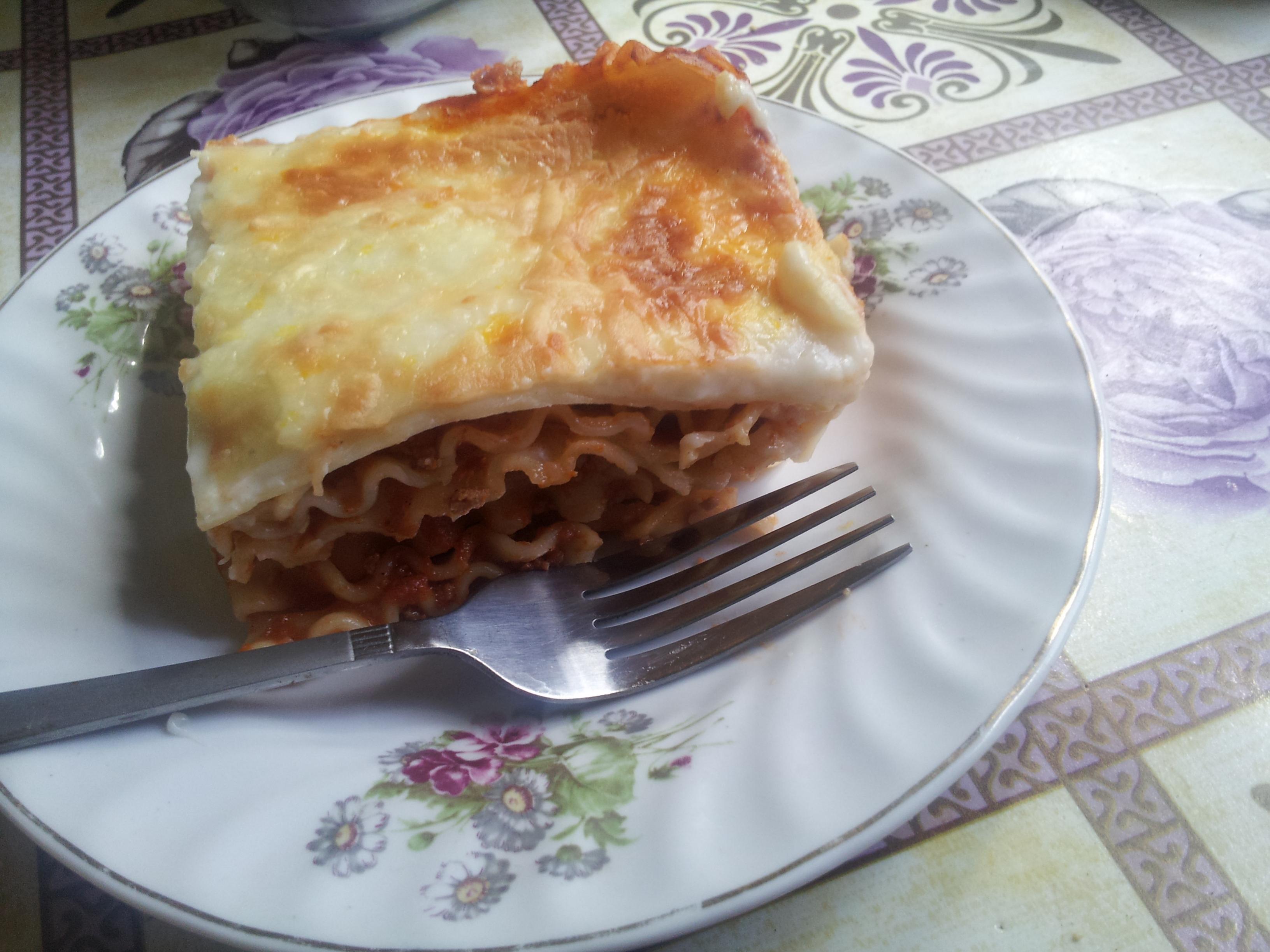 نجلب طبق فرن مستطيل مناسب لطول قطع اللزانيه ونمسحه بالزبدة ونرشه بالطحين ثم نبدأ برص قطع اللزانيه وعليها طبقه من اللحم والصلصه الحمراء ورشه خفيفه من صلصة البشاميل وهكذا بالتناوب حتى ننهي قطع اللزانيه ونغطيه بطبقه كامله من صلصة البشاميل ومن ثم طبقه من جبن الموزريلا المبروش وندخلها الفرن لمدة تتراوح بين ٣٠ و٤٠ دقيقه