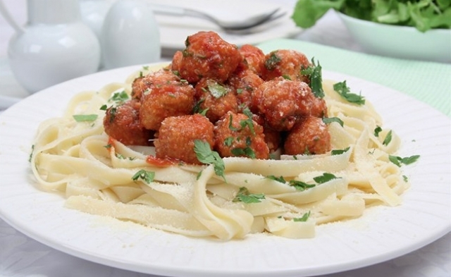 • كُرَاتُ الدَّجَاجِ بالمَعكَرُونة مَع صَلصَةِ الطَّمَاطِم والجُبن