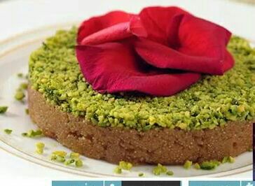 5. توضع الحلاوة في قالب وتُزين بالعسل والفستق على الوجه، وتُقدم بدرجة حرارة الغرفة.