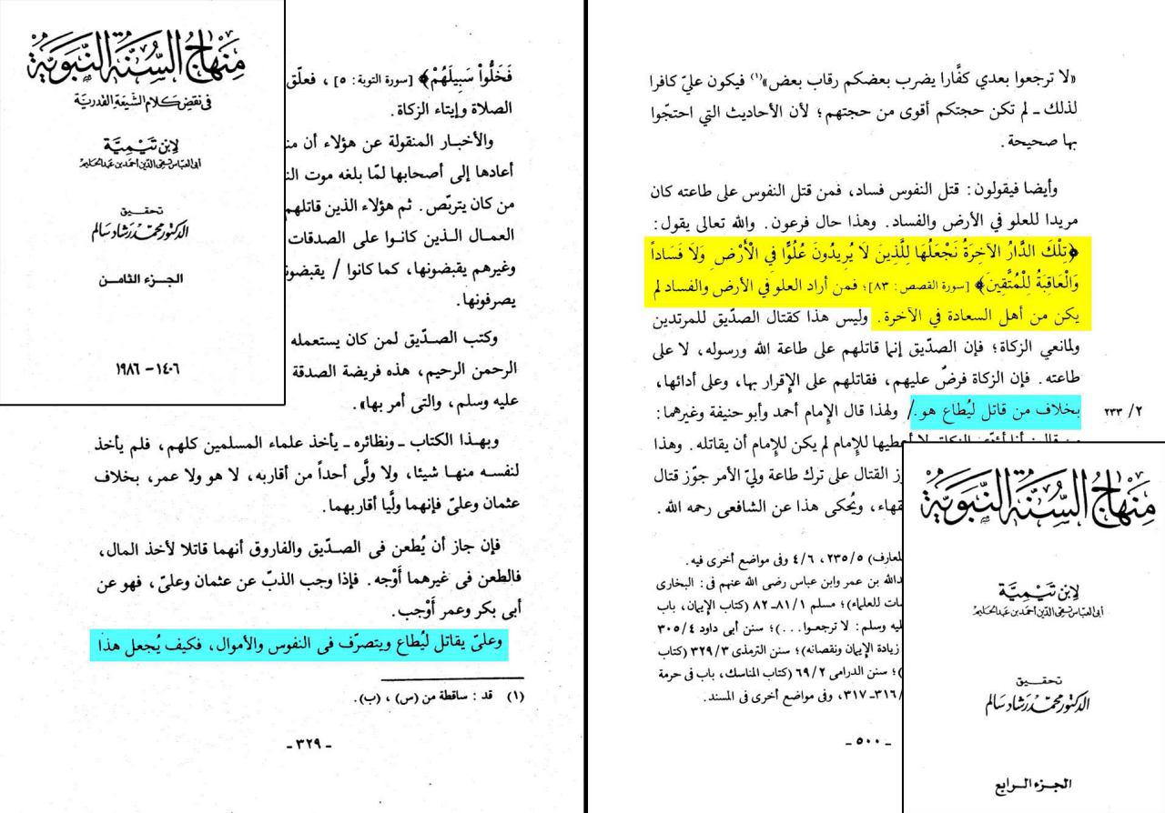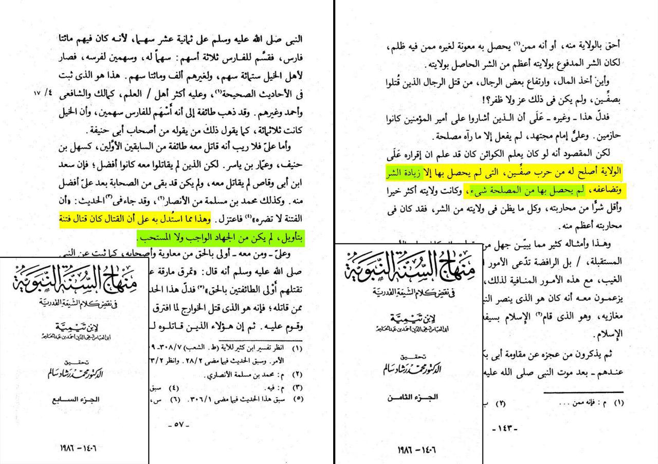 هل بعد هذا البیان و التوضیح والاجماع الذي رواه علماء اهل السنة ياتي ابن تیمیَة وحسب عادته ويكذب ويدلس ويدعي ان امير المؤمنين حارب لاجل الدنيا وان حروب علي لم يحصل بها الا زيادة الشر ؟ولم تكن اي مصلحة فيها ؟