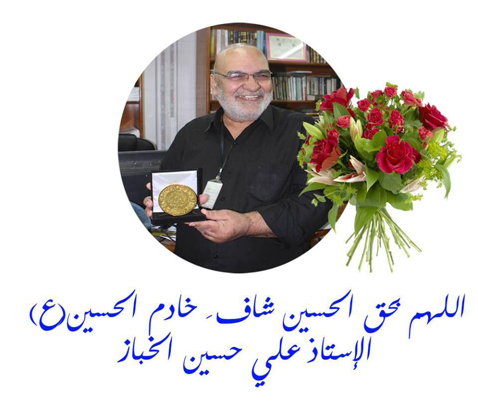 أستاذي الغالي ومعلمي الأب الحنون والأخ الغالي علي حسين الخباز سمعت بأن سرير المرض قد احتضن الكلمات المفعمة بالحب والولاء لك ياصاحب القلب الكبير أدعوا من الباري أن يشفيك ويلبسك ثوب العافية بحق الحسين الشهيد ..