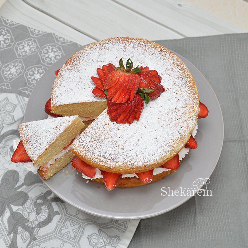 توضع طبقة الكيك الثانية ثم ترش بالسكر البودرة و تزين بحبات الفراولة