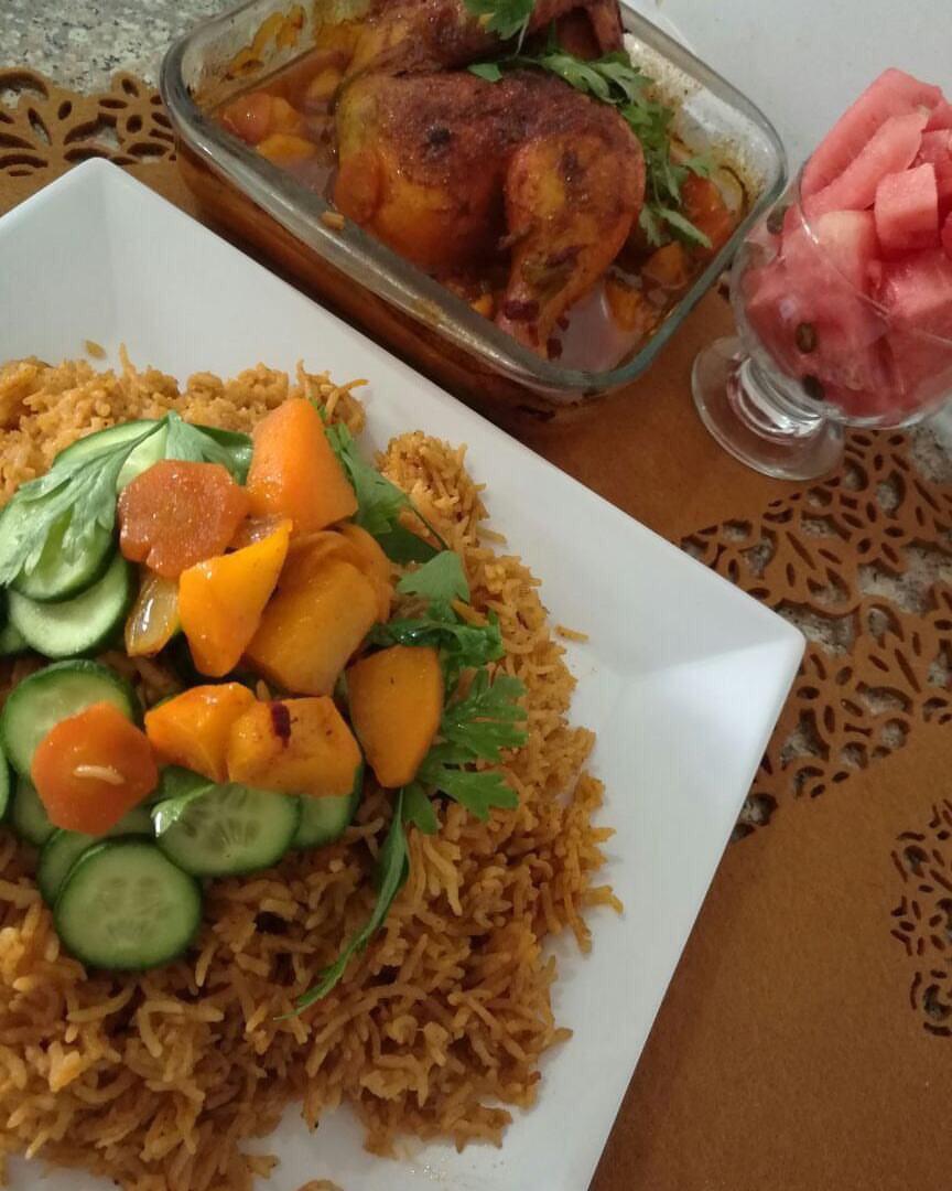 نحتاج الى ٣بصل حجم متوسط مقطع مربعات صغيرة ..مع فصين ثوم مبشور نحمصهم جميع مع قليل زيت الى ان يصبح لونة بني داكن بعدها اضيف حبة طماط مقطع مربعات واخلية على نار هادئة الى ان يذوب الطماط ويدبل البصل بعدها اضيف ٣ملاعق معجون الطماط واخلية على نفس هدوء النار وبعدها اضيف ٣اكواب ماء مع اضافة البهارات ..والملح والبهارات الصحيحة(مسمار ..والدارسين وحبات الهيل والمطحون) واخلية يطبخ لمدة عشر دقائق وبعدها اضيف الرز(الرز يكون مغسول من قبل ومنقوع) الى ان ينشف الماء وبعدها اخلية على نار هادئة حتى يلين الرز ..