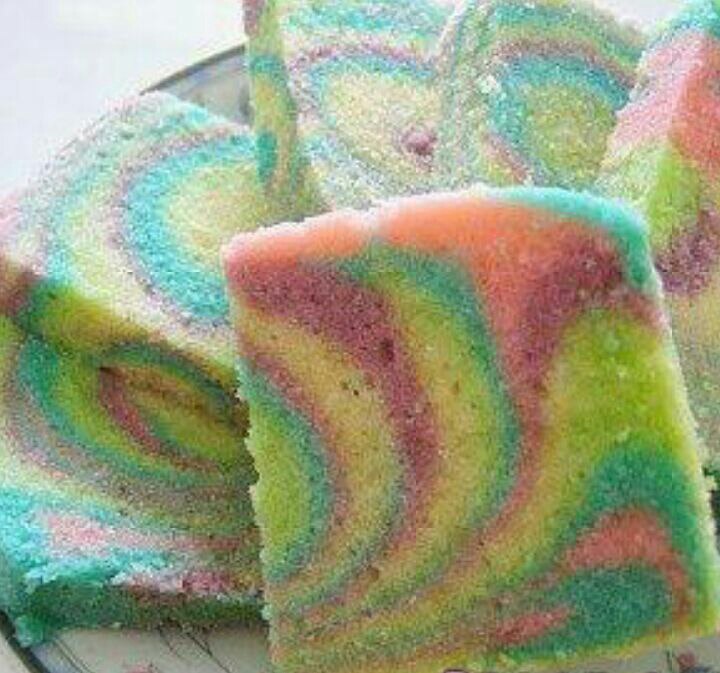 7 - تسكب الألوان الخمسة على شكل طبقات دائرية وعشوائية فى صينية خبز مدهونة بالزبد.