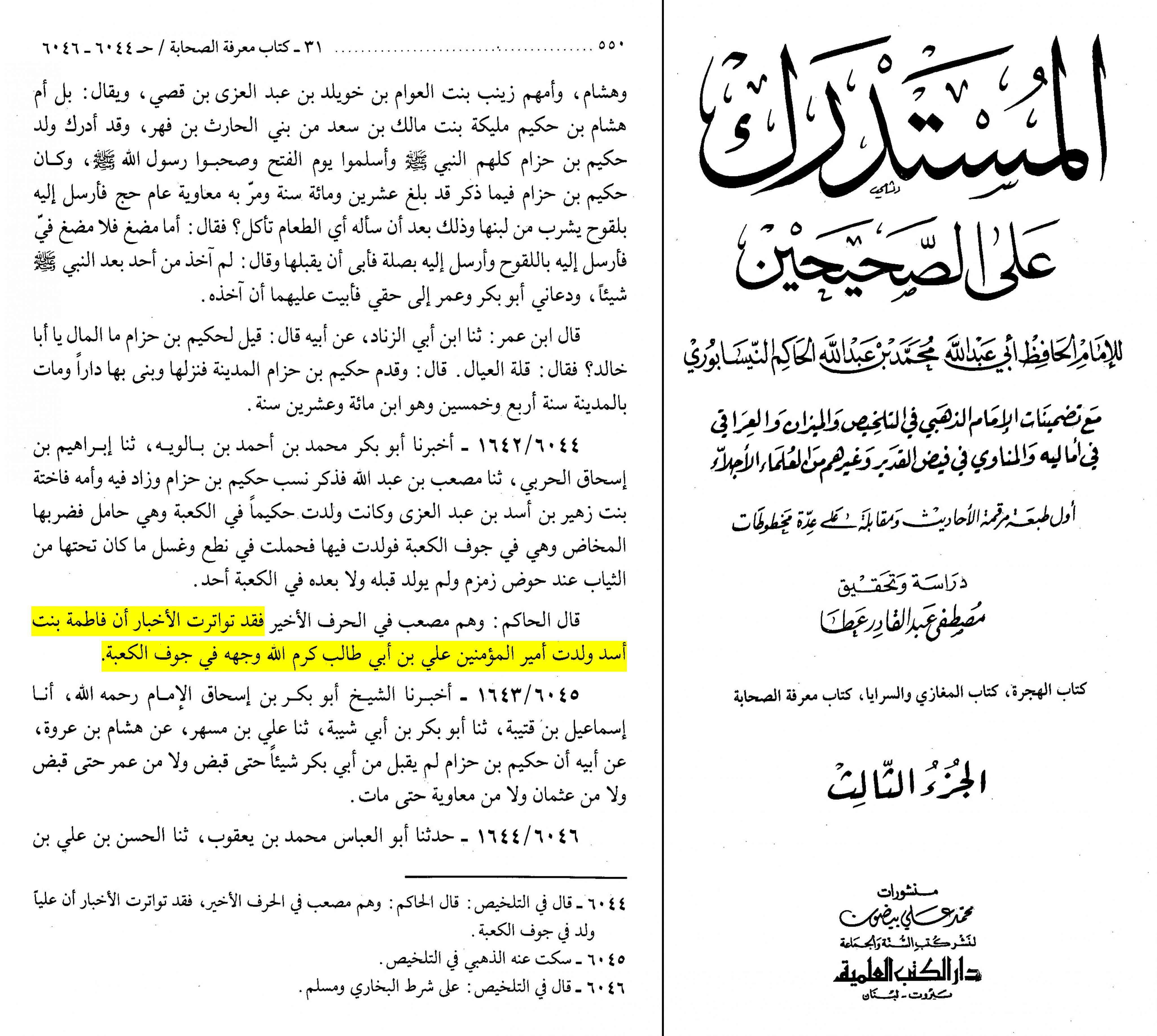 قال الحاكم النيسابوري في (المستدرك على الصحيحين ج6 ص337 ط. دار التأصيل) في ذكر مناقب حكيم بن حزام القرشي : "فقد تواترت الأخبار أنَّ فاطمة بنت أسد وَلَدَتْ أميرَ المؤمنين عليَّ بن أبي طالبٍ كَرَّمَ الله وجهه في جَوْفِ الكعبة".
