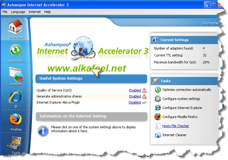 برنامج Ashampoo Internet Accelerator مهمته تحسين وتسريع الأنترنت وتقليل من حجم الصفحات التي تتصفحها ، تستطيع بواسطة هذا البرنامج تسريع الأنترنت وتتخلص من مشاكل بطئ التصفح ، حيث انه يقوم بتغير الإعدادات في الوندوز والمتصفح وهو يتعامل مع الانترنت اكسبلورر والفايرفوكس