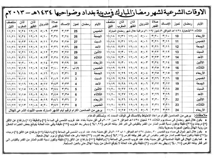 امساكية شهر رمضان الصادرة من مكتب المرجع الاعلى السيد السيستاني حفضه الله