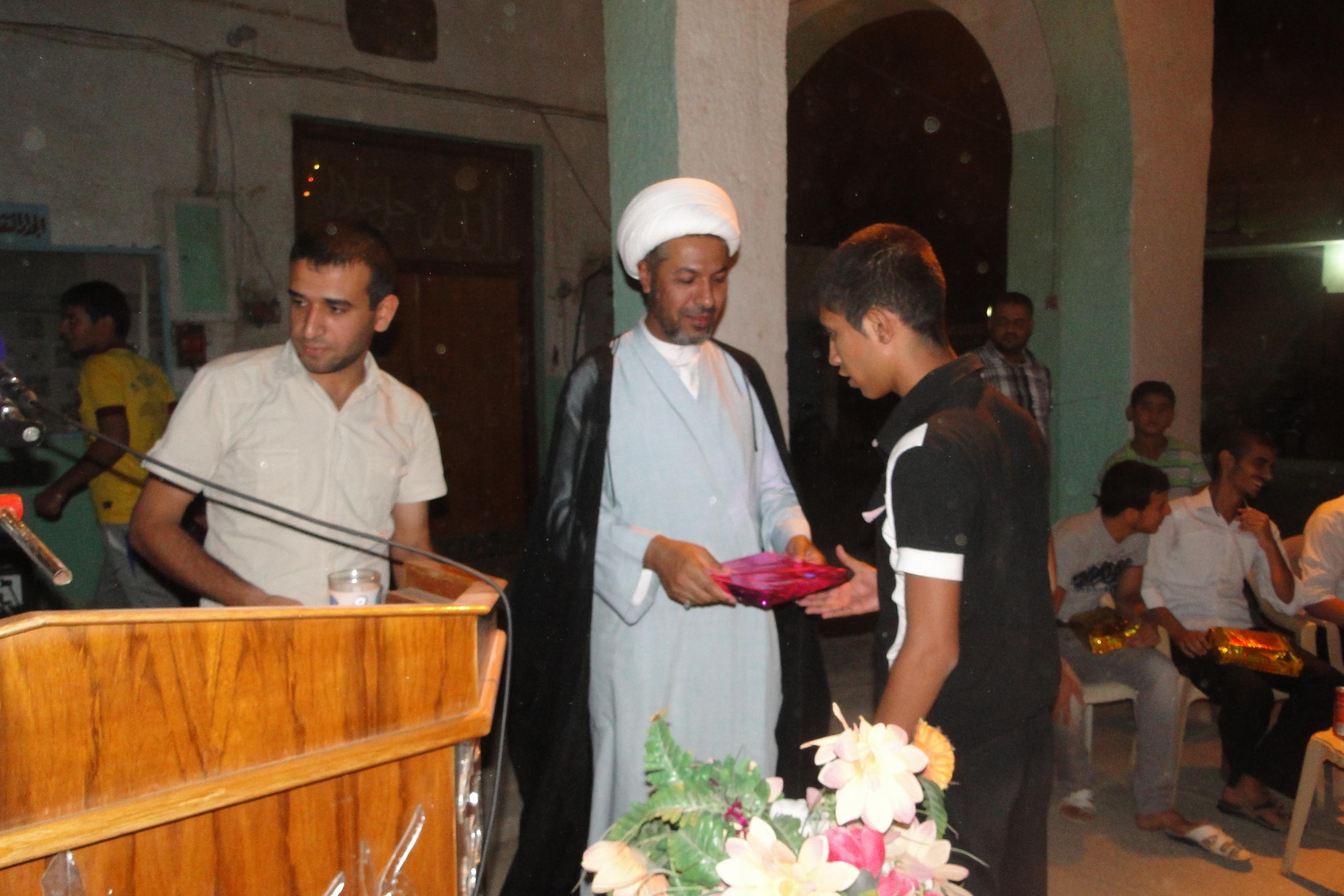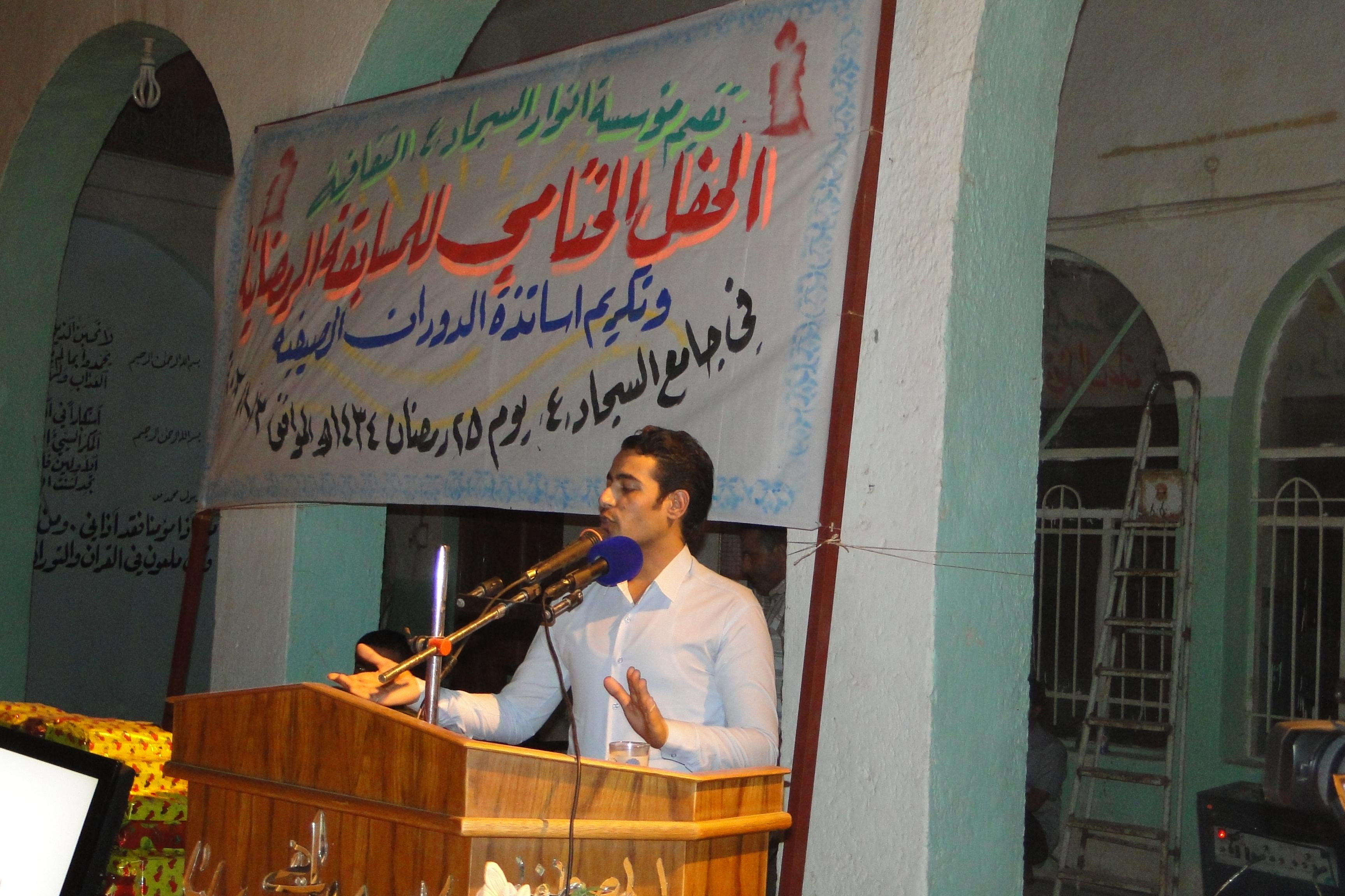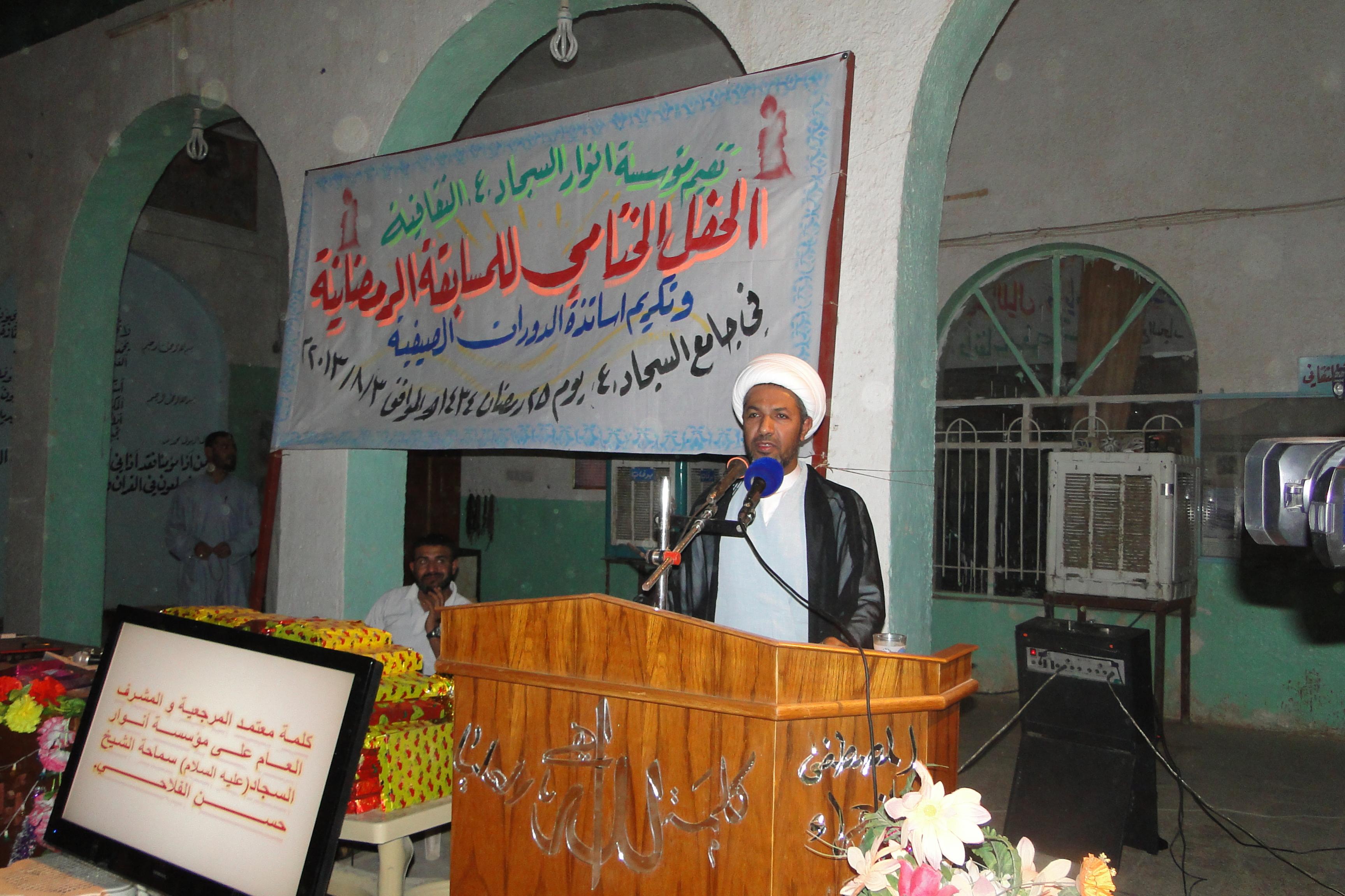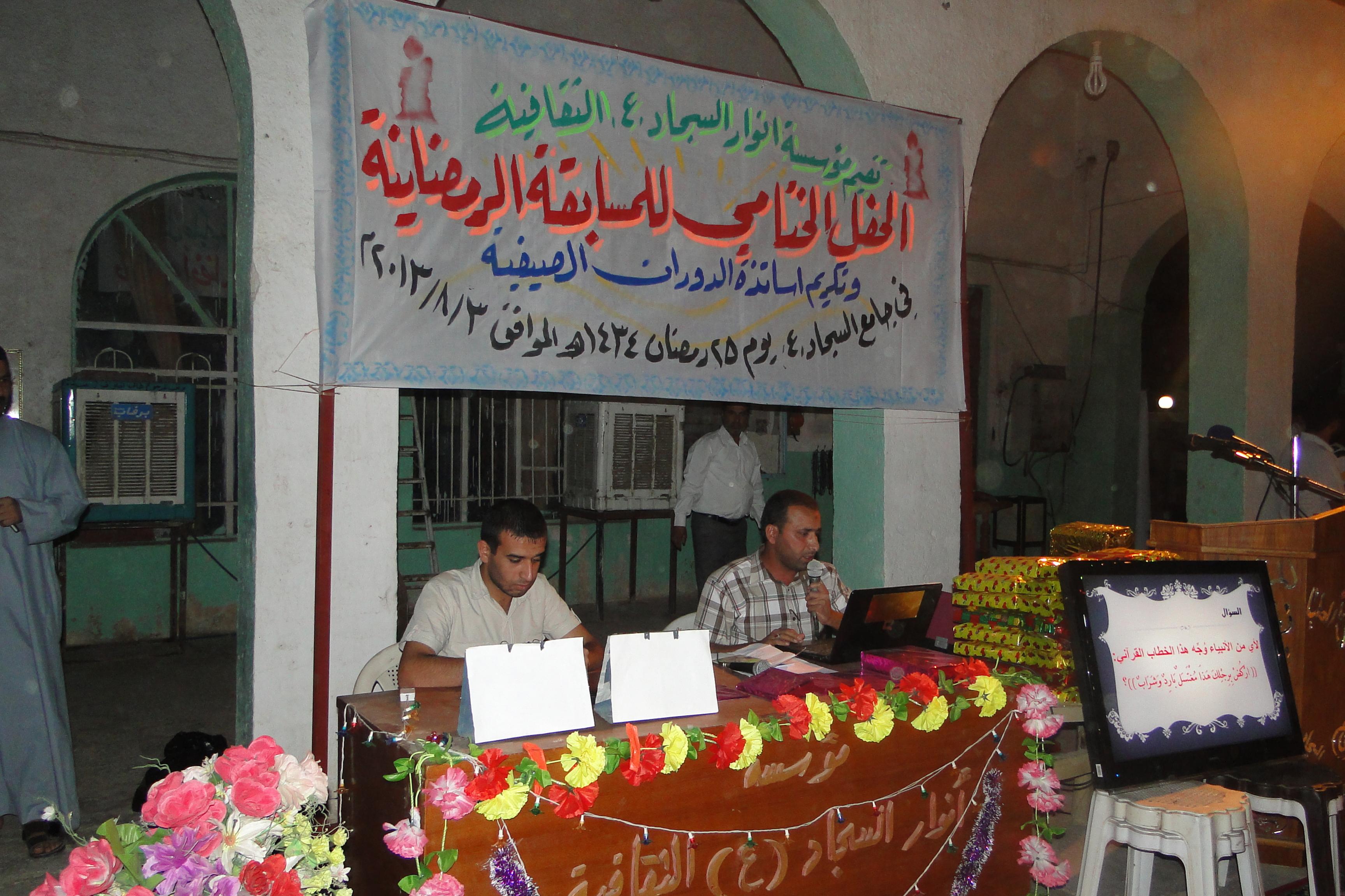 أقام قسم النشاط العام في مؤسسة انوار السجاد عليه السلام الحفل الختامي للمسابقة الرمضانية الاولى وتخلل الحفل تكريم الفريق الفائز بالمركز الاول فريق الولاية والفريق الفائز بالمركز الثاني فريق سعيد بن جبير رضوان الله عليه والفرق المشاركة بالمسابقة وكان برنامج الحفل