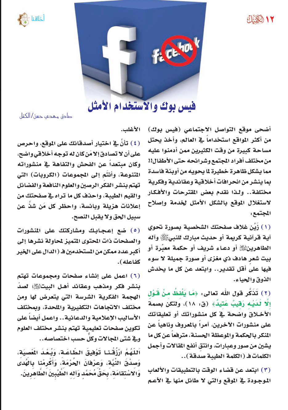 ·زَيِّن غلاف صفحتك الشخصية بصورة تحوي آية قرآنية كريمة أو حديث مبارك للنبي (صلى الله عليه وآله وسلم) وآله الطاهرين (عليهم السلام) أو دعاء شريف أو حكمة معبِّرة أو بيت شعرٍ هادف ذي مغزى أو صورة جميلة لا سوء فيها على أقل تقدير..وأبتعد عن كل ما يخدش الذوق والحياء. ·تَذَكَّر قول الله تعالى ((مَا يَلْفِظُ مِنْ قَوْلٍ إِلَّا لَدَيْهِ رَقِيبٌ عَتِيدٌ))(ق:18) ولتكن بصمة الأخلاق واضحة في كل منشوراتك أو تعليقاتك على منشورات الآخرين آمراً بالمعروف وناهياً عن المنكر بالحكمة والموعظة الحسنة مترفعاً عن كل ما يشين من صور وعبارات وأنتقِ أنفع المقالات وأجمل الكلمات و(الكلمة الطيبة صدقة).. ·ابتعد عن قضاء الوقت بالتطبيقات والألعاب الموجودة في الموقع والتي لا طائل منها في الأعم الأغلب ·تأنَّ في اختيار أصدقائك على الموقع وأحرص على أن لا تصادق إلا من كان له توجه أخلاقي واضح وكان مبتعداً عن الفحش والتفاهة في منشوراته المتنوعة وأنتَمِ إلى المجموعات (الگروبات) التي تهتم بنشر الفكر الرصين والعلوم النافعة والفضائل والقيم الطيبة وأحذف كل ما تراه في صفحتك من إعلانات هزيلة وبائسة. ·ضع إعجابك ومشاركتك على المنشورات والصفحات ذات المحتوى المتميز لمحاولة نشرها إلى أكبر عدد ممكن من المستخدمين (والدال على الخير كفاعله).*******************