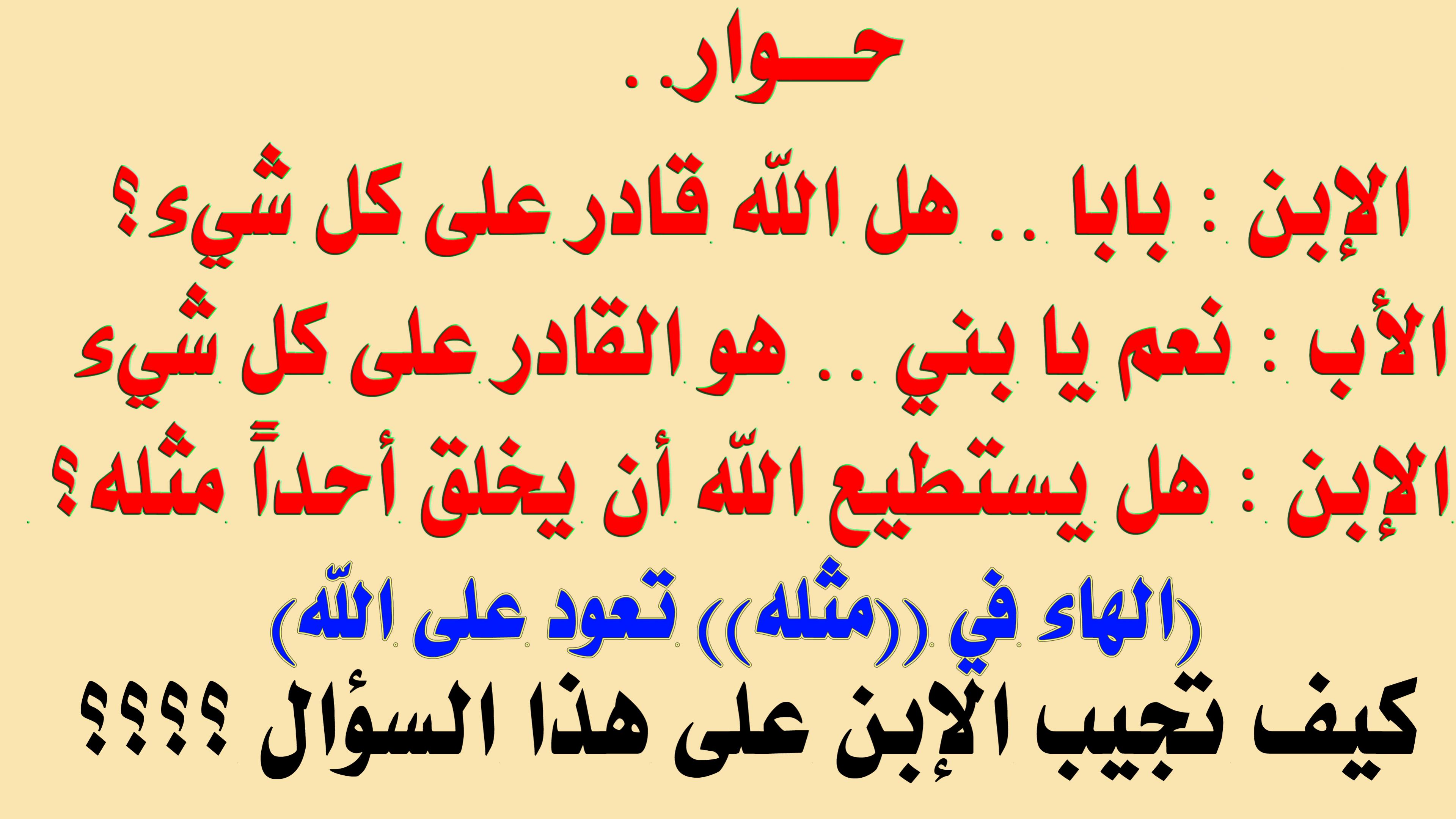 او يجيبه إن الله قادر لكنه لا يخلق احد اخر مثله حتى لا تشتبه الناس بعبادته و-الصلاة له - ويصير الناس بحيرة .. فهل ترضى ان يخلق الله لوالدك شبيه ؟ بحيث تبقى محتار لا تميز من هو ابوك الحقيقي ؟؟!