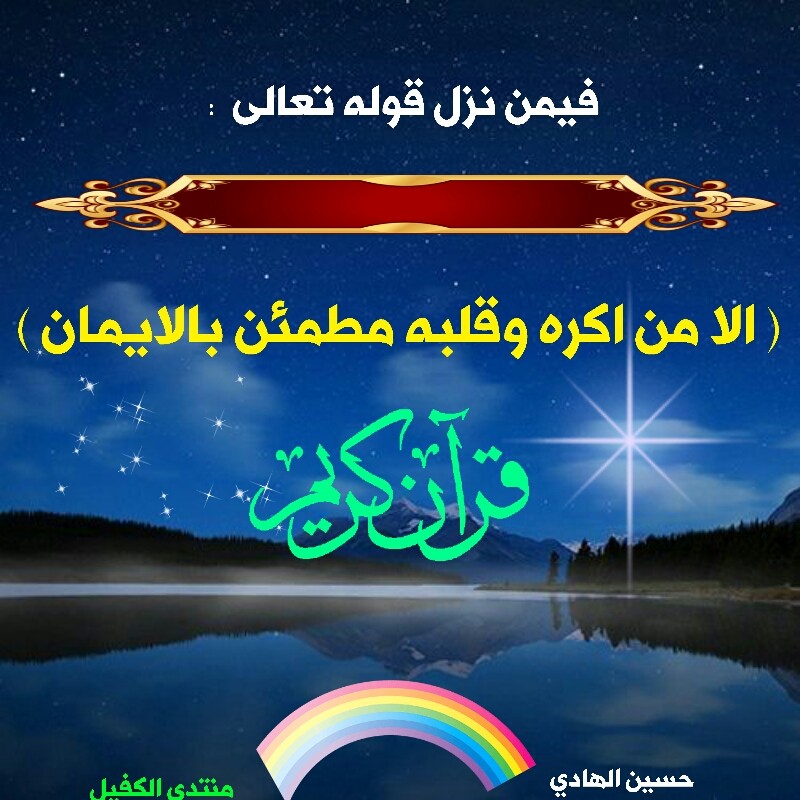 ج. نزلت الاية في الصحابي عمار بن ياسر ،عندما شاهد قريش وهي تعذب امه واباه امام عينه فلم يستطع ان يقاوم ذلك المشهد ،ولكنه اعتذر من رسول الله .ص. بعد ذلك وطلب منه الصفح وان يعفو الله عنه ،فنزلت هذه الاية و بشره الرسول .ص. عندما قال له يا ال ياسر ان موعدكم الجنة .وان الله قد عفا عنه لانه كان تحت وطأة التعذيب والترهيب ...