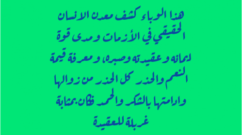 هذا الوباء كشف معدن الانسان الحقيقي في الأزمات ومدى قوة ايمانه وعقيدته وصبره، ومعرفة قيمة النعم والحذر كل الحذر من زوالها وادامتها بالشكر والحمد فكان بمثابة غربلة للعقيدة. ودمتم سالمين.
