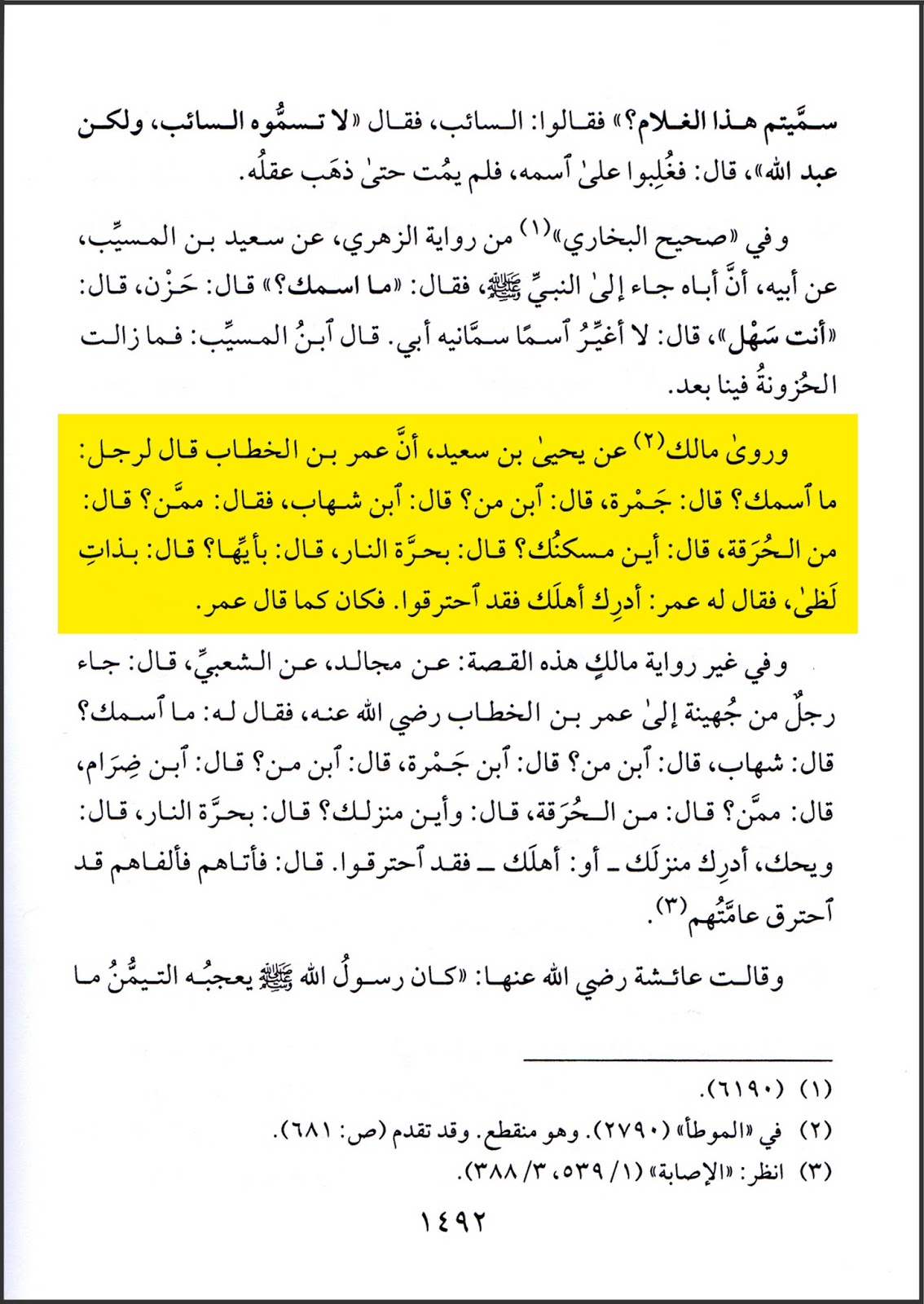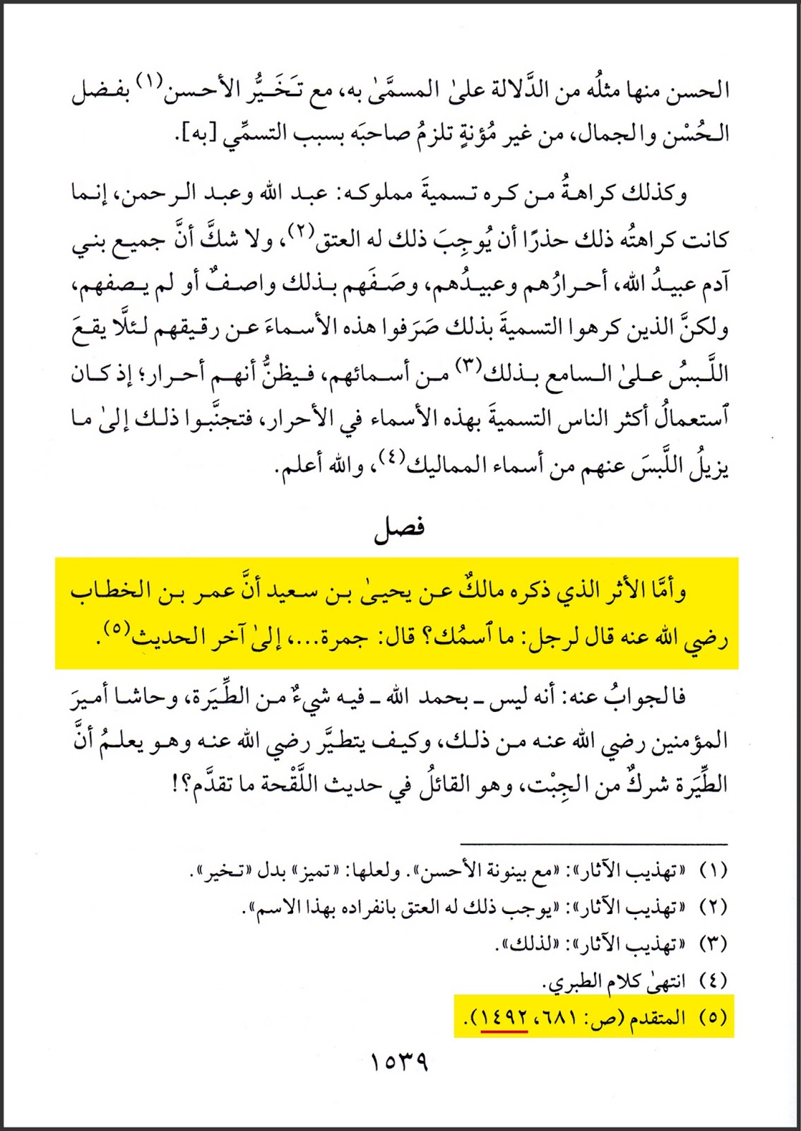 ثم قال في نفس الكتاب (ص1539-1542): (وأما الأثر الذي ذكره مالك عن يحيى بن سعيد أن عمر بن الخطاب رضي الله عنه قال لرجل: ما اسمك؟ قال: جمرة..الحديث إلى آخره.