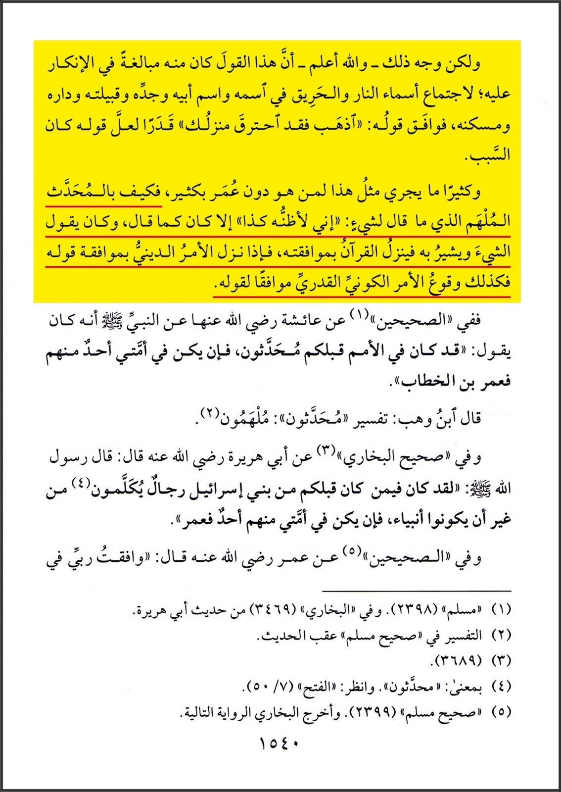 وكثيراً ما يجري مثل هذا لمن هو دون عمر بكثير فكيف بالمُحَدَّثِ المُلْهَمِ الذي ما قال لشيء إني لأظنه كذا إلا كان كما قال، وكان يقول الشيء ويشير به فينزل القرآن بموافقته فإذا نزل الأمر الديني بموافقة قوله فكذلك وقوع الأمر الكوني القدري موافقاً لقوله).