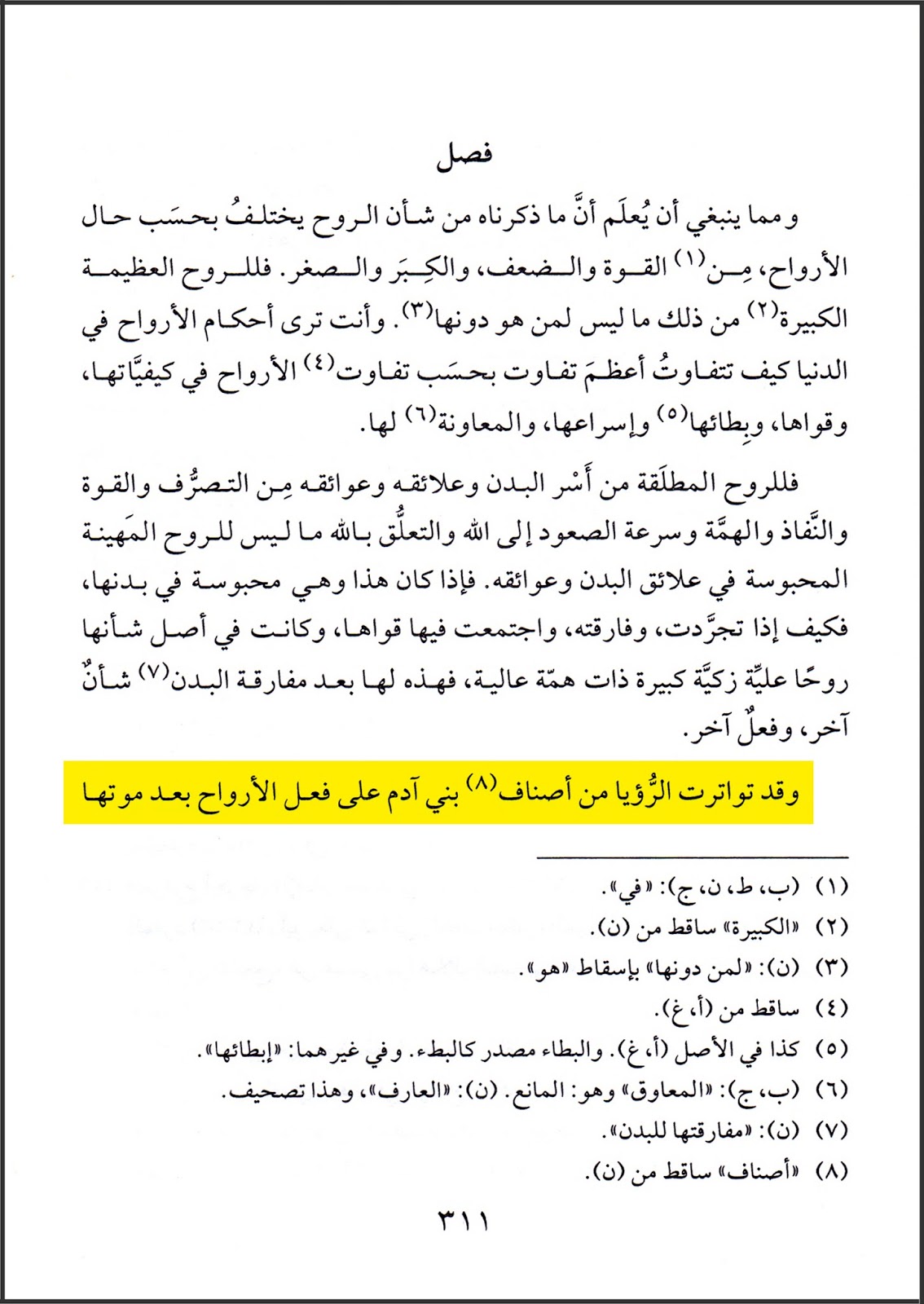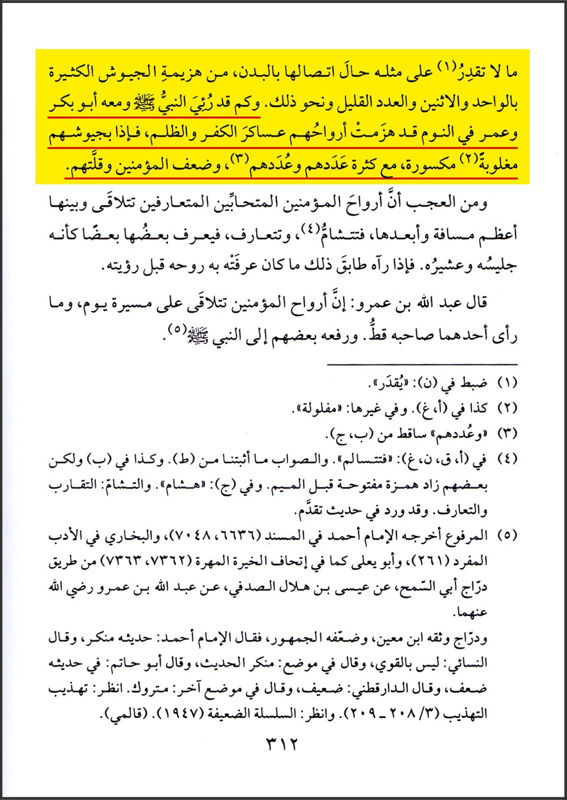 قال ابن قيم الجوزية في كتابه (الروح، ج1، ص311- 312، الناشر: دار عالم الفوائد للنشر والتوزيع/مكة المكرمة، الطبعة الأولى 1433هـ): (وقد تواترت الرؤيا في أصناف بني آدم على فعل الأرواح بعد موتها ما لا تَقْدِرُ على مثله حال اتصالها بالبدن، من هزيمة الجيوش الكثيرة بالواحد والاثنين والعدد القليل ونحو ذلك، وكم قد رُئِيَ النبيُّ ومعه أبو بكر وعمر في النوم قد هزمت أرواحهم عساكر الكفر والظلم فإذا بجيوشهم مغلوبة مكسورة مع كثرة عددهم وعددهم وضعف المؤمنين وقلتهم).