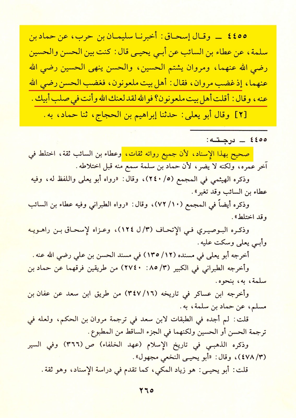 [٢] ما رواه الحافظ إسحاق بن راهويه في مسنده: (أخبرنا سليمان بن حرب، عن حماد بن سلمة، عن عطاء بن السائب عن أبي يحيى قال: كنت بين الحسن والحسين رضي الله عنهما، ومروان يشتم الحسين، والحسن ينهى الحسين رضي الله عنهما، إذ غضب مروان، فقال: أهل بيت ملعونون. فغضب الحسن رضي الله عنه وقال: أقلت أهل بيت ملعونون؟ فوالله لقد لعنك الله وأنت في صلب أبيك) [المطالب العالية بزوائد المسانيد الثمانية، ج١٨، ص٢٦٥، رقم الحديث ٤٤٥٥)، وقال المحقق عبد القادر جوندل: (صحيحٌ بهذا الإسناد).