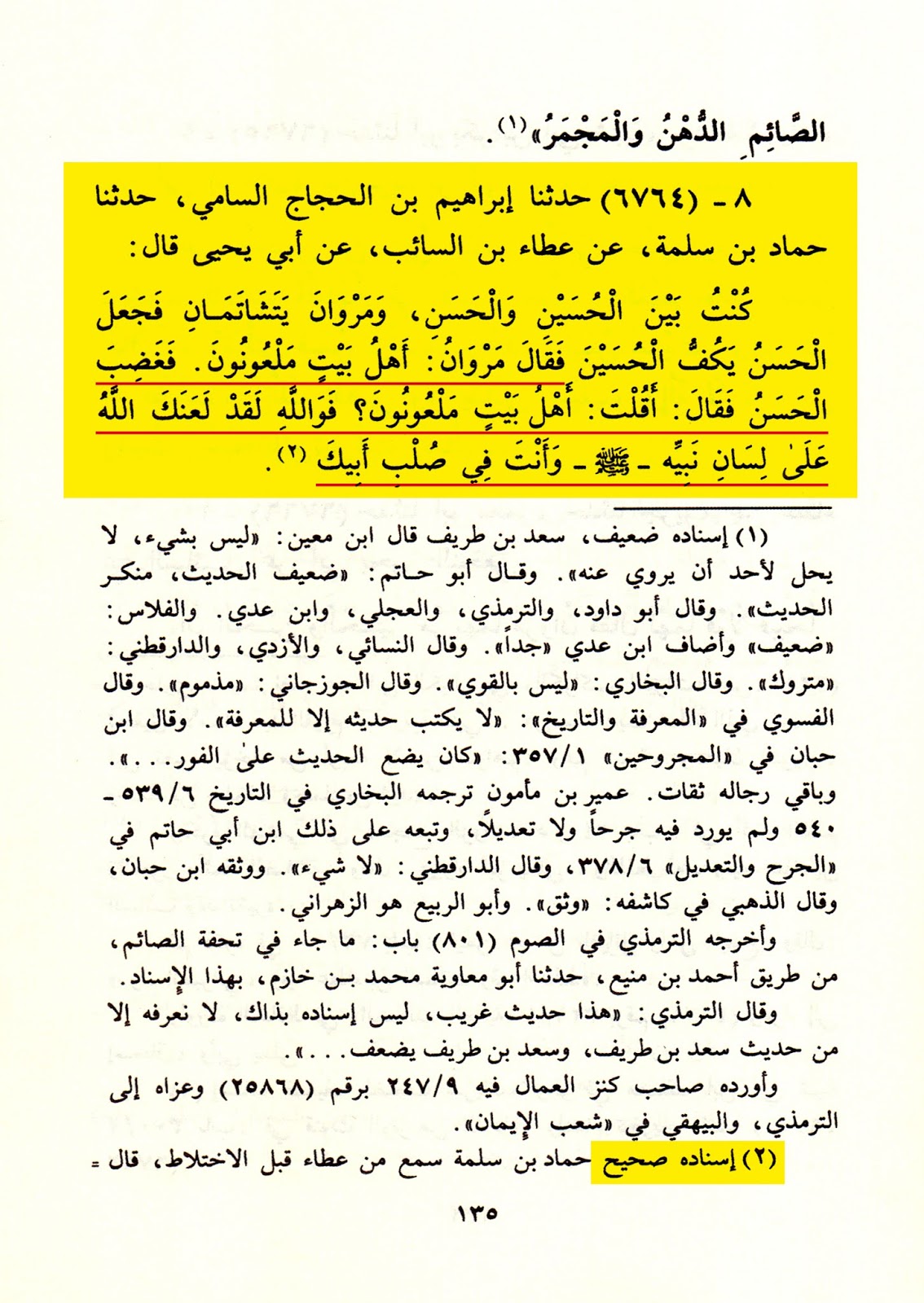 [١] ما رواه الحافظُ أبو يعلى الموصليّ في مسنده: (حدثنا إبراهيم بن الحجاج السامي، حدثنا حماد بن سلمة، عن عطاء بن السائب، عن أبي يحيى، قال: كنت بين الحسين والحسن، ومروان يتشاتمان فجعل الحسنُ يكفُّ الحسين، فقال مروان: أهل بيت ملعونون. فغضب الحسن، فقال: أقلت: أهل بيت ملعونون؟ فوالله لقد لعنك الله على لسان نبيه صلى الله عليه وسلم وأنت في صلب أبيك) [مسند أبي يعلى الموصلي، ج١٢، ص١٣٥، رقم الحديث ٦٧٦٤)، قال المحقق حسين سليم أسد: (إسناده صحيح).