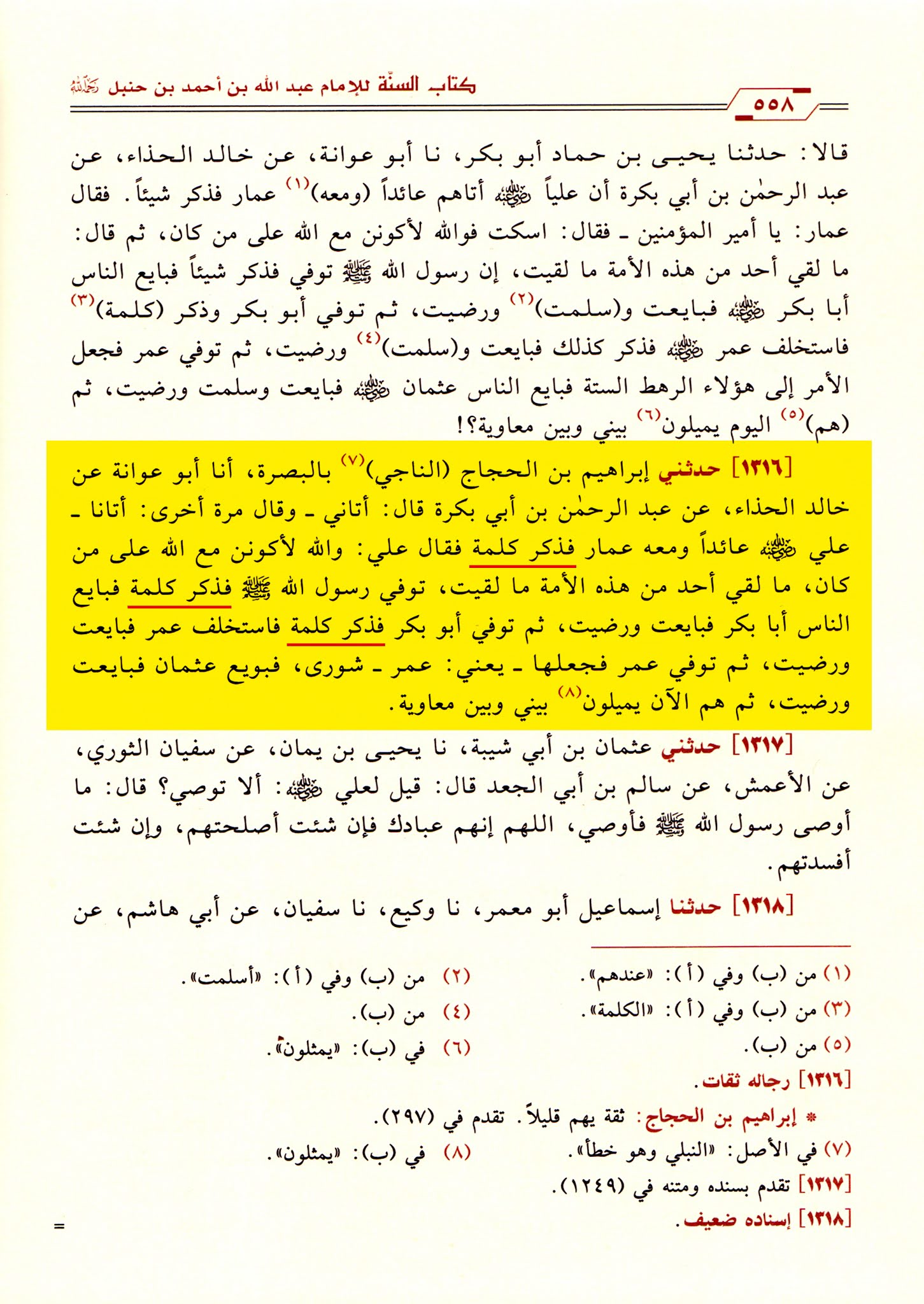 وقد نقل عبد الله بن أحمد بن حنبل هذه الرواية في كتابه (السنة، ج٢، ص٥٥٨، رقم الحديث ١٣١٦) إلا أنّه قد أُبهِمَ هذا المطلب بكلامٍ لا يُفهم منه شيءٌ، قال: (حدثني إبراهيم بن الحجاج الناجي بالبصرة، أنا أبو عوانة، عن خالد الحذاء، عن عبد الرحمن بن أبي بكرة، قال: أتاني - وقال مرة أخرى -: أتانا علي رضي الله عنه عائداً ومعه عمار فذكر كلمة، فقال علي: «والله لأكونن مع الله على من كان، ما لقي أحد من هذه الأمة ما لقيت، توفي رسول الله صلى الله عليه وسلم فذكر كلمة فبايع الناس أبا بكر فبايعت ورضيت، ثم توفي أبو بكر فذكر كلمة فاستخلف عمر فبايعت ورضيت، ثم توفي عمر فجعلها - يعني عمر - شورى فبويع عثمان فبايعت ورضيت، ثم هم الآن يميلون بيني وبين معاوية»).