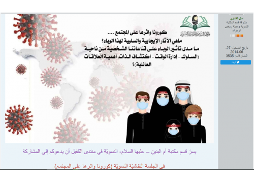 أقام قسم مكتبة السيّدة أمّ البنين (عليها السلام) النسويّة في منتدى الكفيل العالميّ جلسة نقاشيّة بعنوان: (كورونا ... أثرها في المجتمع)، بتاريخ: 21/2/2021 ، الموافق لـ 8/ رجب/1442 هـ، وذلك في ضمن برنامجها التثقيفيّ الأسبوعيّ الذي يسلّط الضوء على قضايا اجتماعيّة، ودينيّة، وثقافيّة متنوّعة، ويأتي اختيار هذا الموضوع نظراً لأهميّته القصوى في الوقت الراهن؛ ولتوضيح أثره المباشر وغير المباشر في المجتمع بشكل عام، وقد تمّ بيان الآثار التي تركت بصمتها على كافة الجوانب وفي كلّ مناحي الحياة.