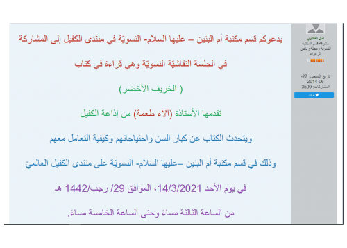 أقام قسم مكتبة السيّدة أمّ البنين – عليها السلام- النسويّة في منتدى الكفيل جلسة نقاشيّة نسويّة وهي قراءة في كتاب (الخريف الأخضر)، في يوم الأحد 14/3/2020، الموافق 29/ رجب/1442 هـ، ويتحدث الكتاب عن كبار السنّ واحتياجاتهم، وكيفيّة التعامل معهم، وتضمّن الكتاب عدداً من المواضيع المهمّة التي تصبّ في المحور الرئيس الذي يخدم شريحة كبار السنّ، وطرائق التعامل معهم، وقدّمت الجلسة الأستاذة (آلاء آل طعمة) من إذاعة الكفيل، والتي أوضحت قائلةً: