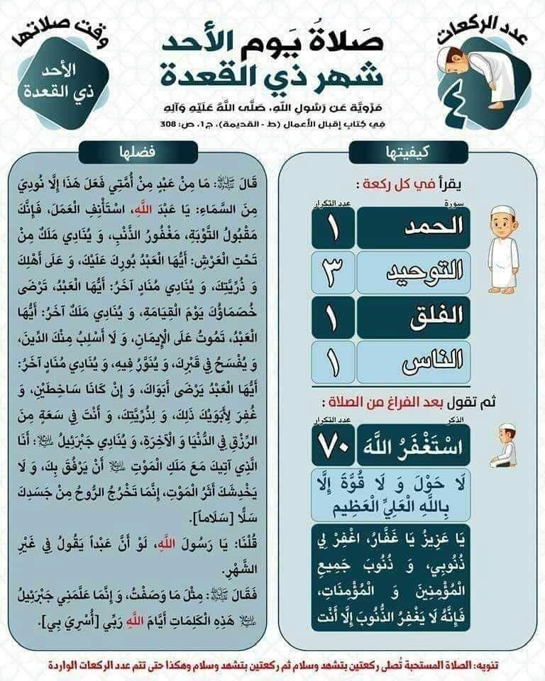 - و يصلّي أربع ركعات يقرأ في كل منهما الحمد مرّة و قل هو الله أحد ثلاث مرّات و المعوذتين مرّة ثم يستغفر سبعين مرّة (بعد الصلاة )