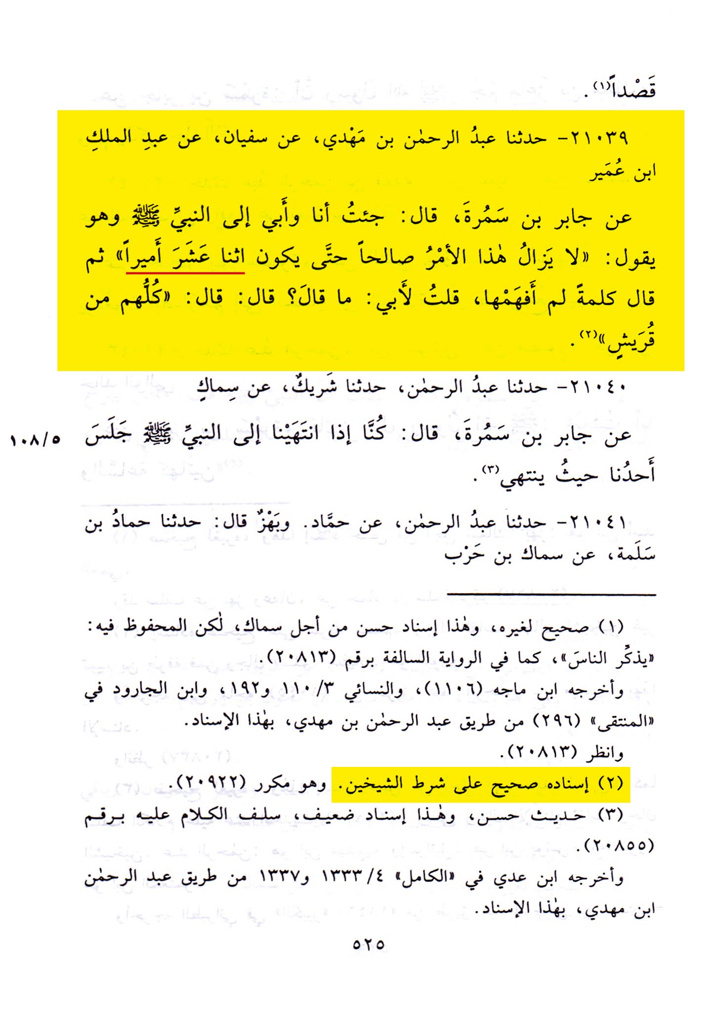 وروى أيضاً: (حدثنا عبدُ الرحمن بن مَهْدي، عن سفيان، عن عبدِ الملكِ بن عُمَير، عن جابر بن سَمُرَة، قال: جئتُ أنا وأَبي إلى النبيِّ صلى الله عليه وسلم وهو يقول: "لا يَزالُ هذا الأمْرُ صالحاً حتَّى يكون اثنا عَشَرَ أَميراً" ثم قال كلمةً لم أَفهَمْها، قلتُ لأَبي: ما قالَ؟ قال: "كُلُّهم من قُرَيشٍ").