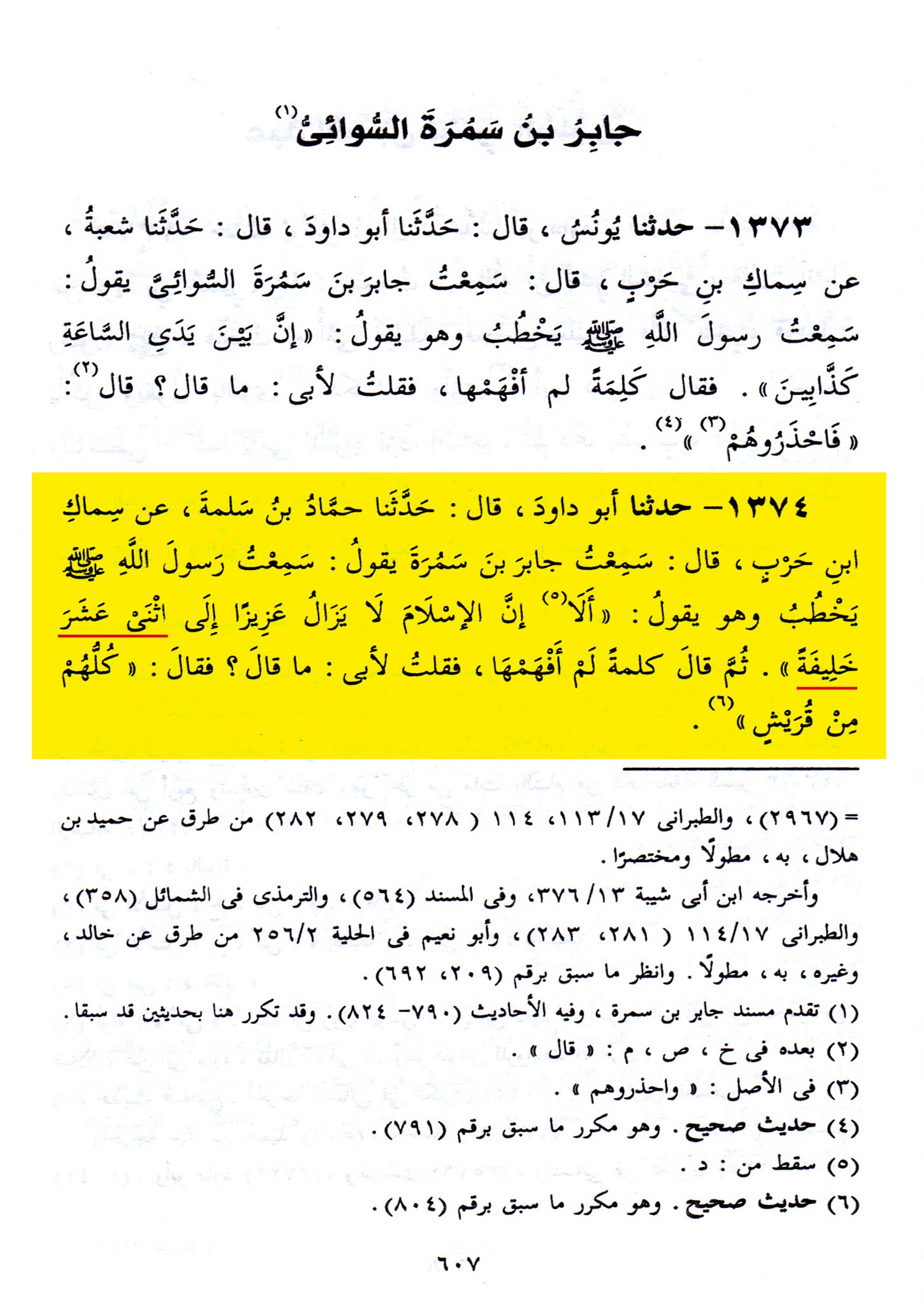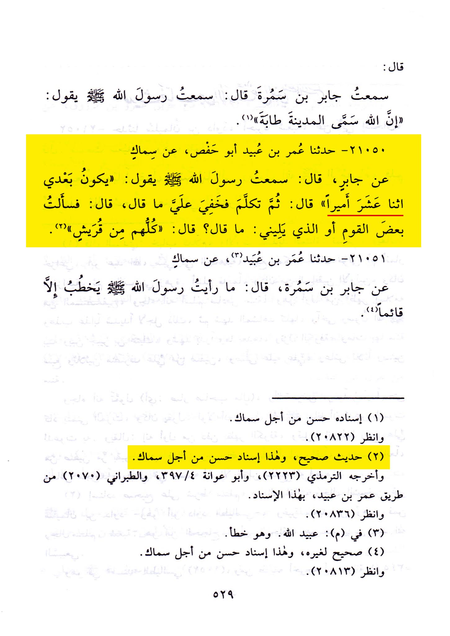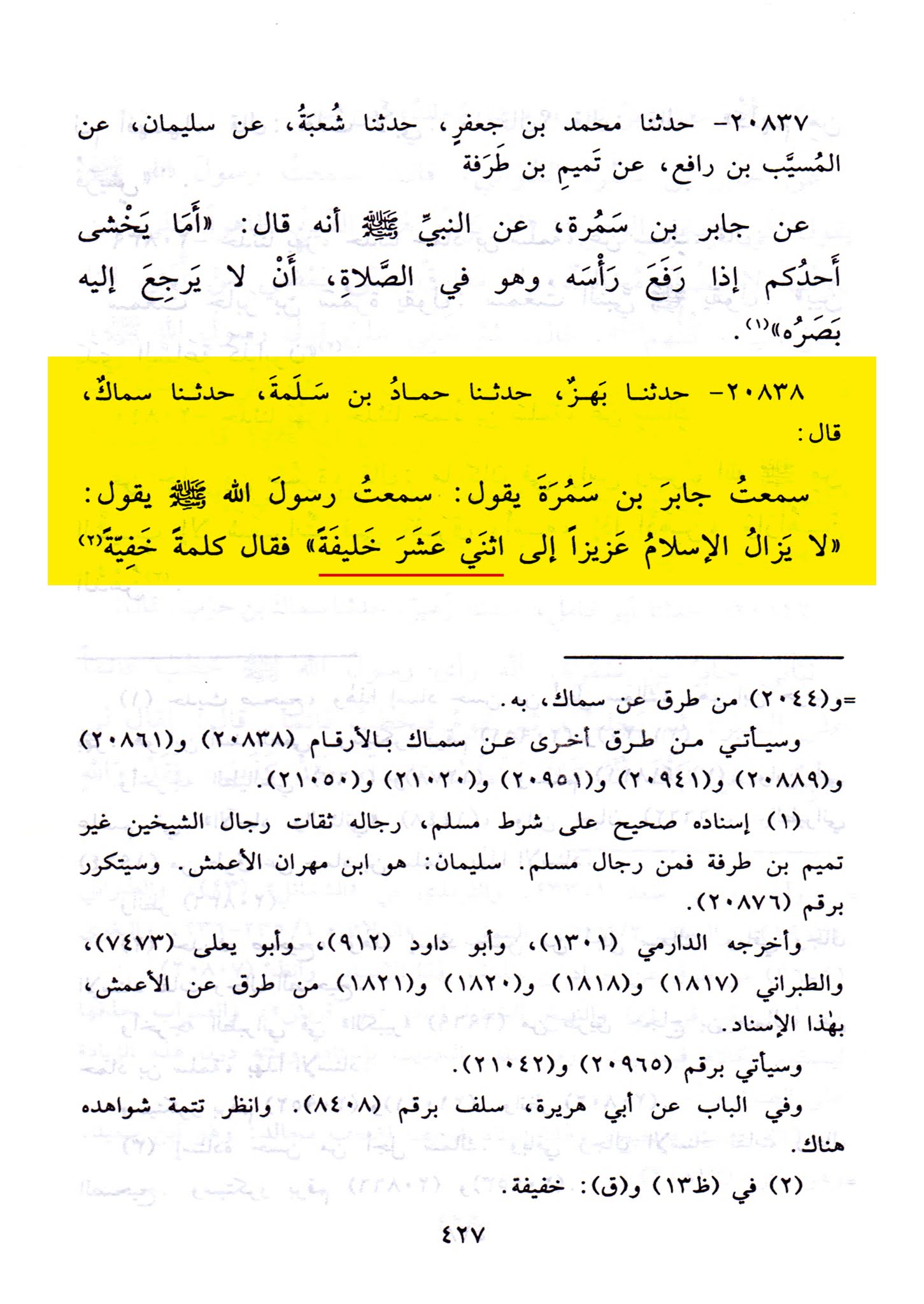 وروى أيضاً: (حدَّثنا حمَّادُ بن سَلمةَ، عن سِماكِ بنِ حَرْبٍ، قال: سَمِعْتُ جابرَ بنَ سَمُرَةَ يقولُ: سَمِعْتُ رَسولَ اللهِ صلى الله عليه وسلم يَخْطُبُ وهو يقول: "أَلَا إنَّ الإسْلَامَ لَا يَزَالُ عَزِيزاً إِلَى اثْنَيْ عَشَرَ خَلِيفَةً". ثُمَّ قالَ كلمةً لَمْ أَفْهَمْهَا، فقلتُ لأبي: ما قالَ؟ فقالَ: "كُلُّهُمْ مِنْ قُرَيْشٍ").