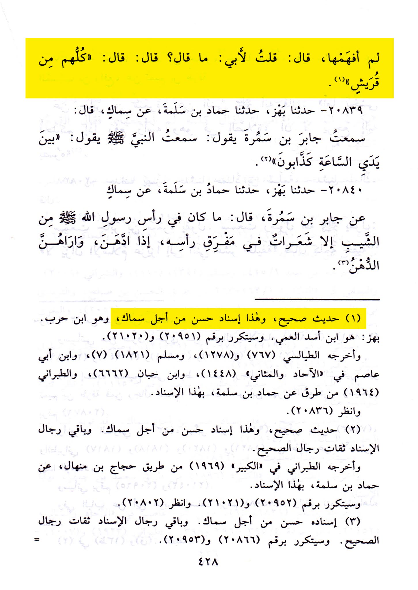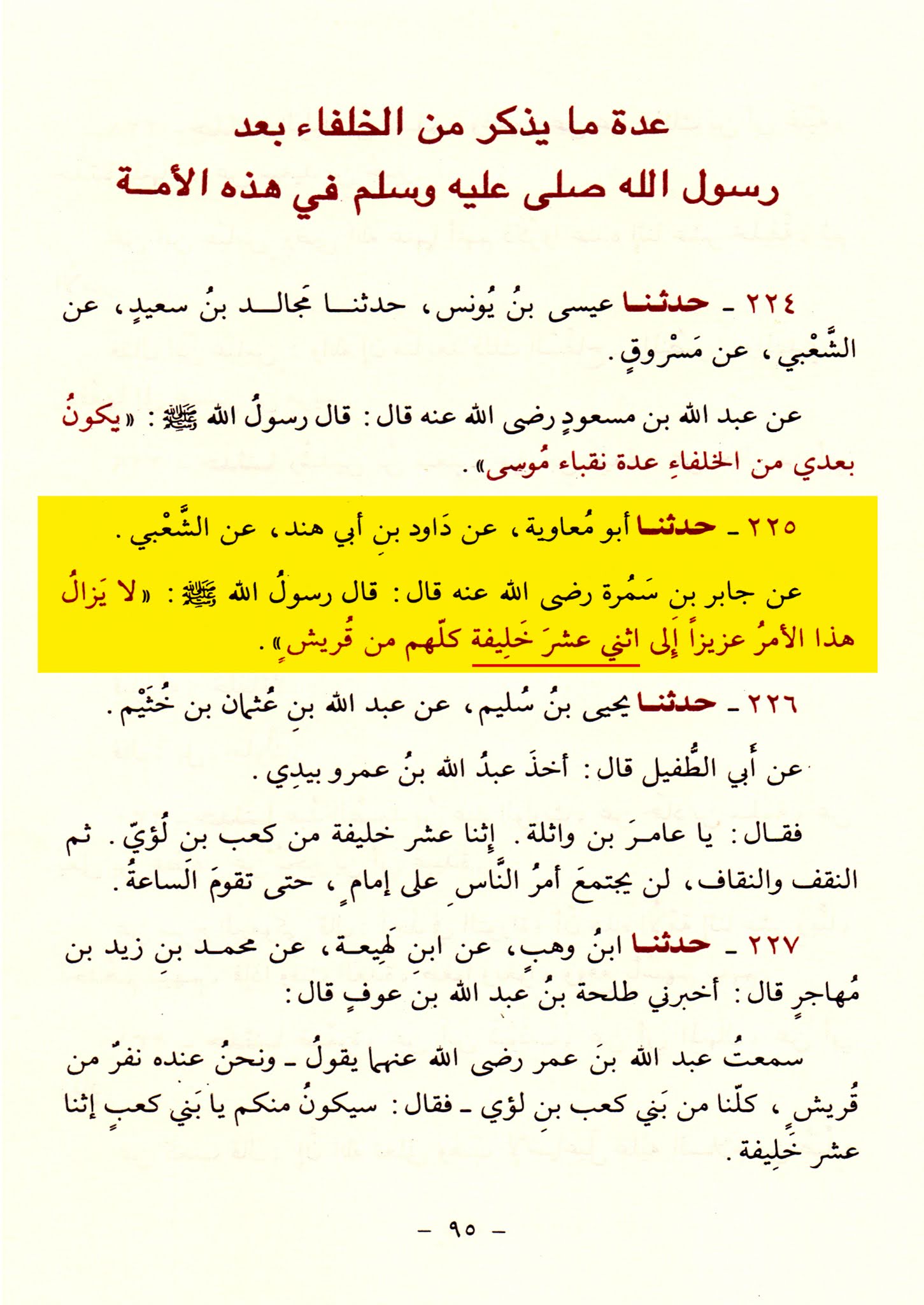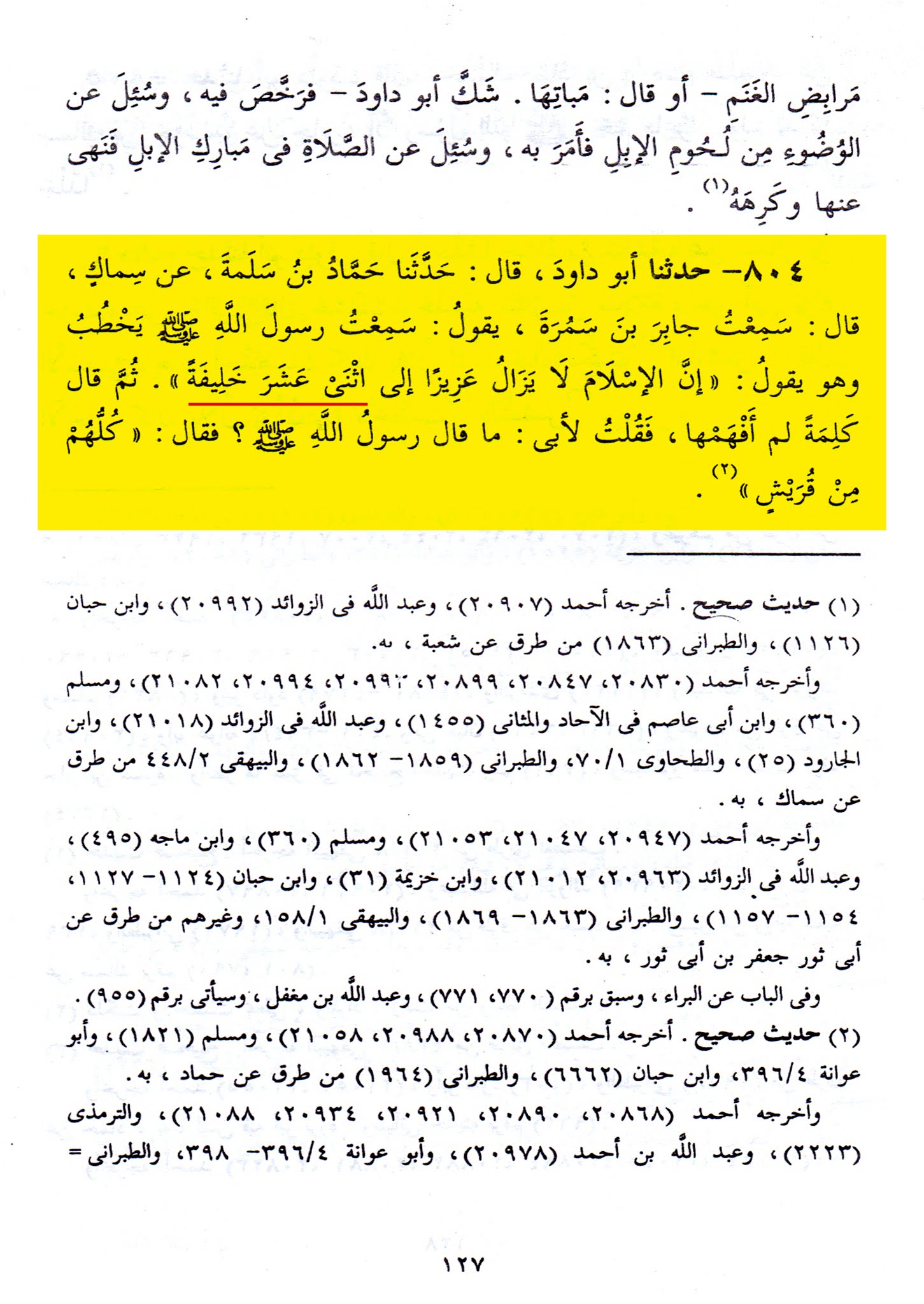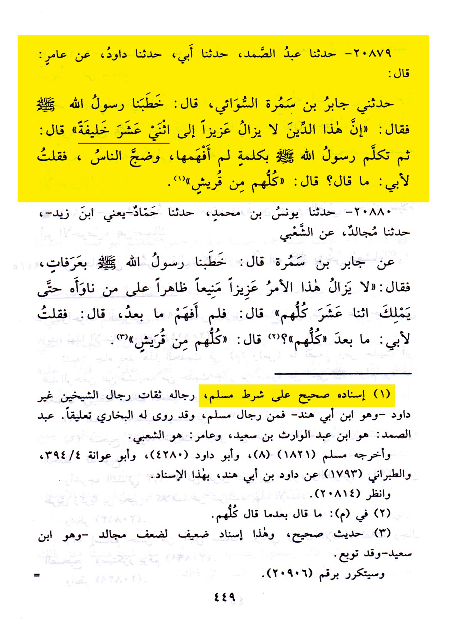 وروى أيضاً: (حدَّثنا حمَّادُ بن سَلمةَ، عن سِماكِ بنِ حَرْبٍ، قال: سَمِعْتُ جابرَ بنَ سَمُرَةَ يقولُ: سَمِعْتُ رَسولَ اللهِ صلى الله عليه وسلم يَخْطُبُ وهو يقول: "أَلَا إنَّ الإسْلَامَ لَا يَزَالُ عَزِيزاً إِلَى اثْنَيْ عَشَرَ خَلِيفَةً". ثُمَّ قالَ كلمةً لَمْ أَفْهَمْهَا، فقلتُ لأبي: ما قالَ؟ فقالَ: "كُلُّهُمْ مِنْ قُرَيْشٍ").
