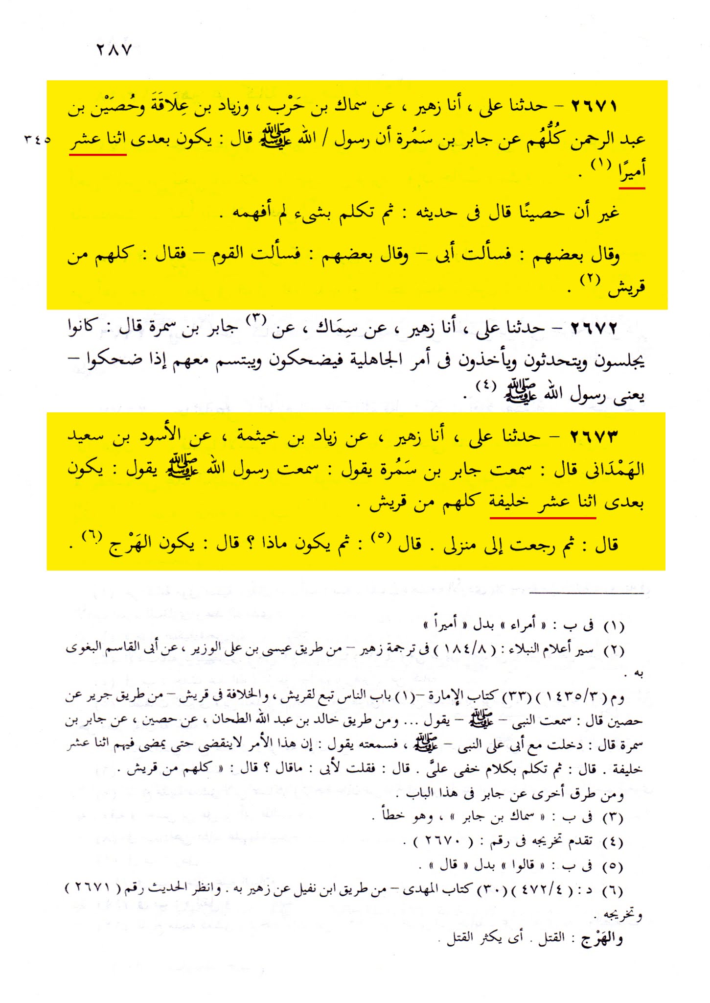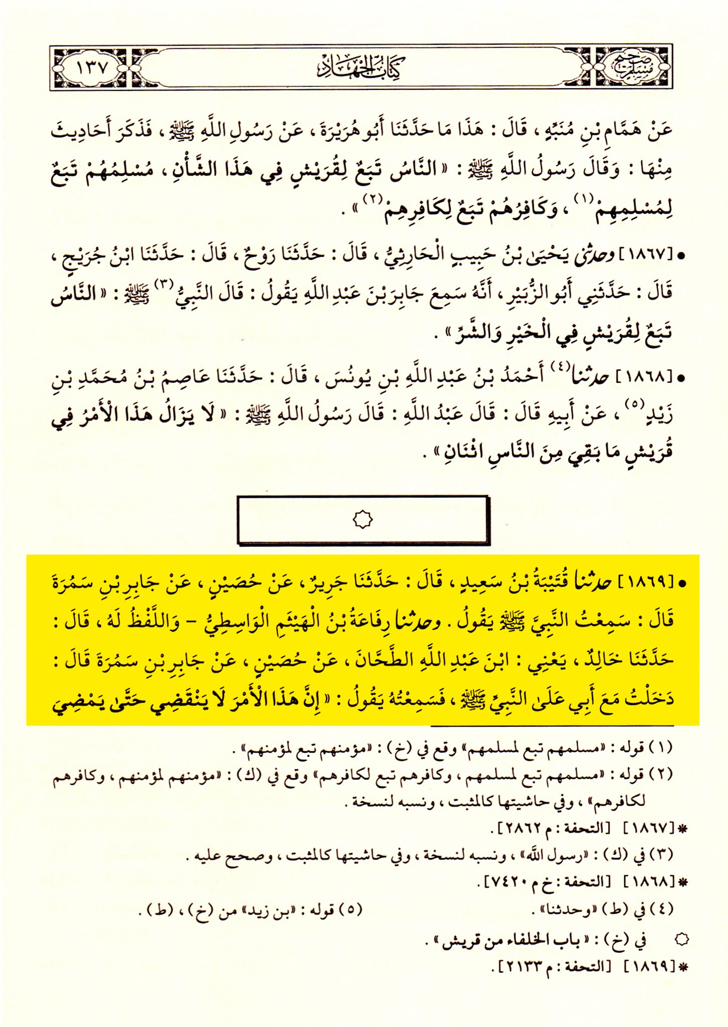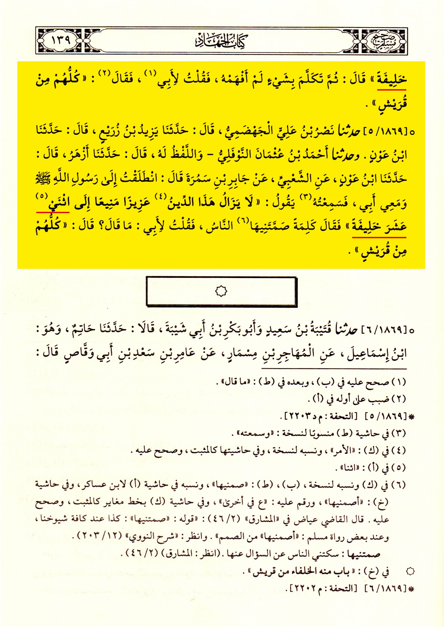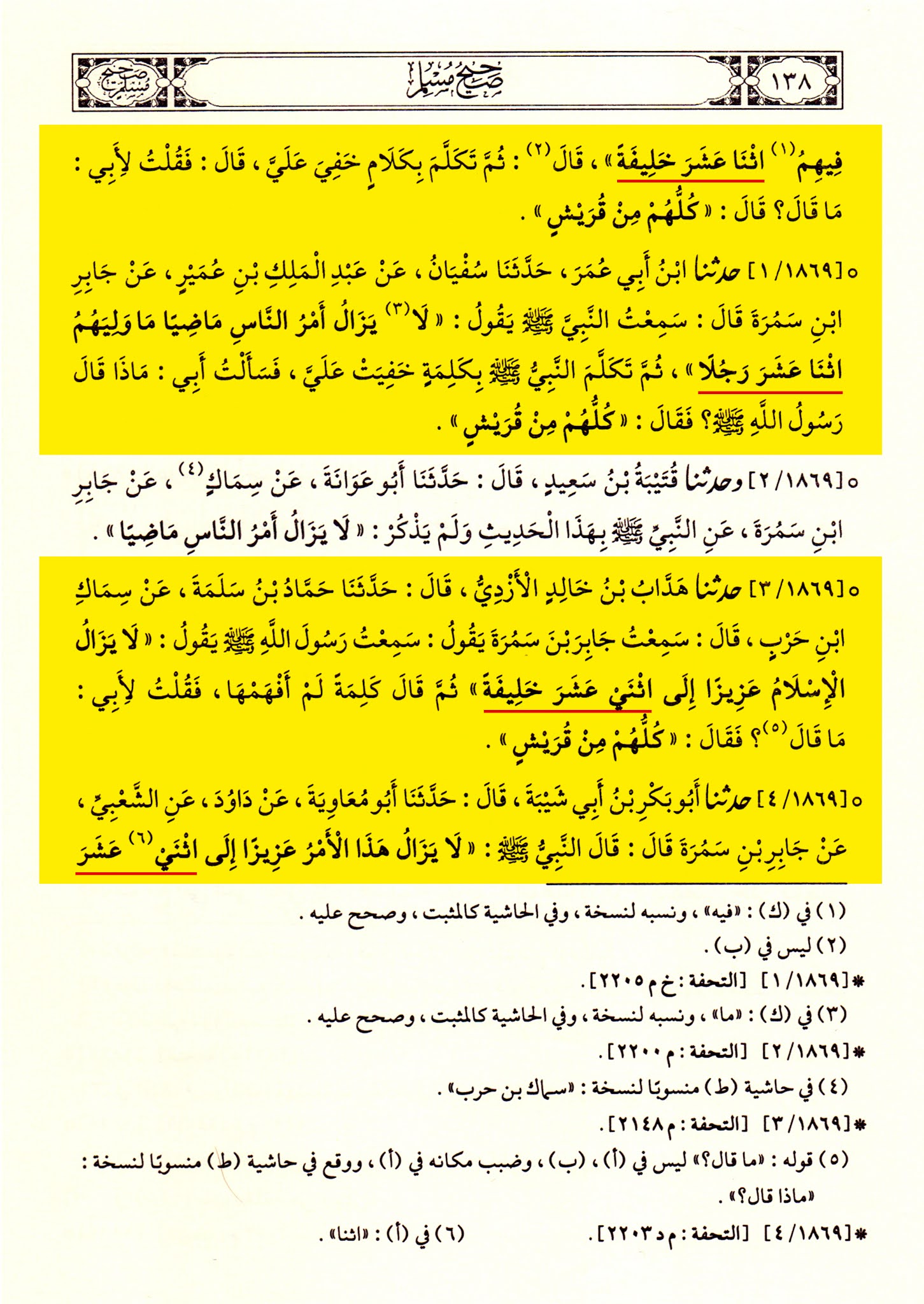 حدَّثنا نَصْرُ بن علي الجَهْضَمِي، قال: حدَّثنا يزيد بن زُرَيْعٍ، حدَّثنا ابن عون. وحدَّثنا أحمد بن عثمان النَّوفَلي - واللَّفظُ له، قال: حدَّثنا أزهَر، قال: حدَّثنا ابن عَوْنٍ، عن الشَّعْبِيِّ، عن جابر بن سمرة، قالَ: انْطَلَقْتُ إلى رسولِ الله صلى الله عليه وسلم، وَمَعِي أبي، فسَمِعْتُهُ يقولُ: "لا يزالُ هذا الدِّينُ عَزِيزاً مَنِيعاً إلى اثني عشر خليفةً" فقالَ كلمةً صَمَّنِيها النَّاسُ، فقلتُ لأبي: ما قالَ؟ قالَ: "كلهم من قريش").