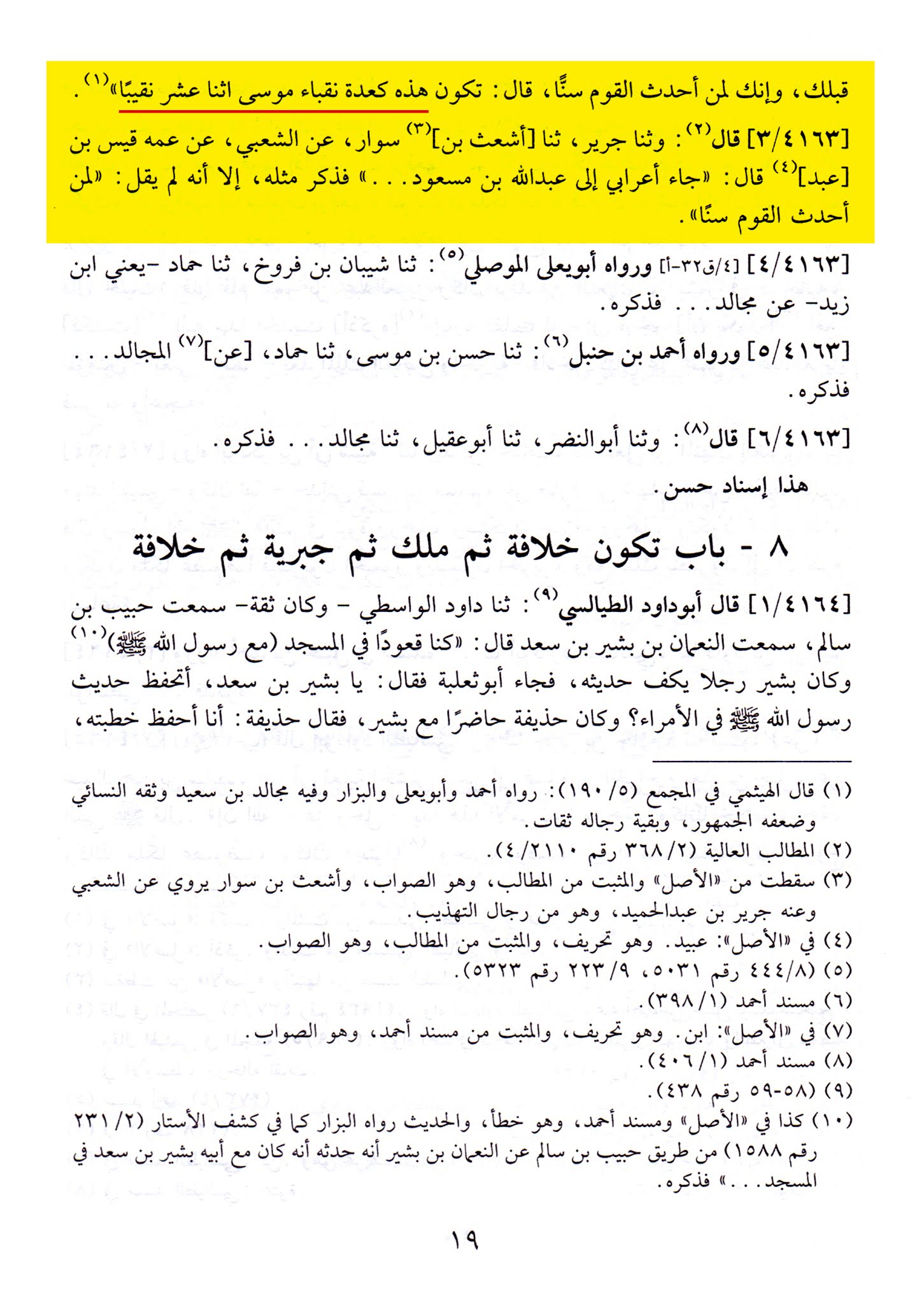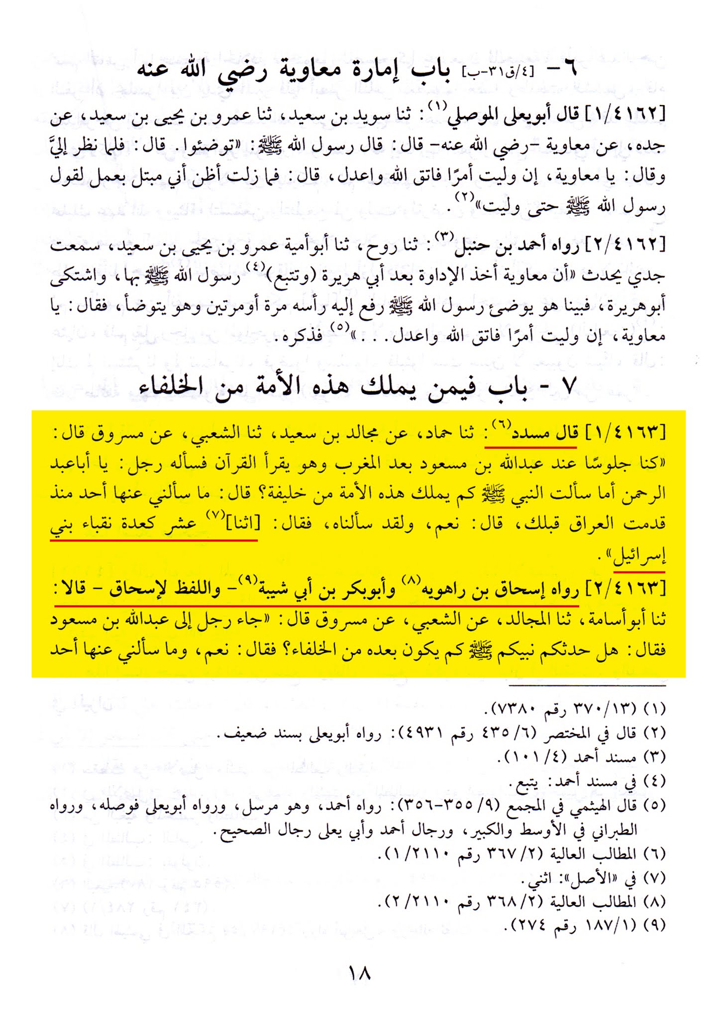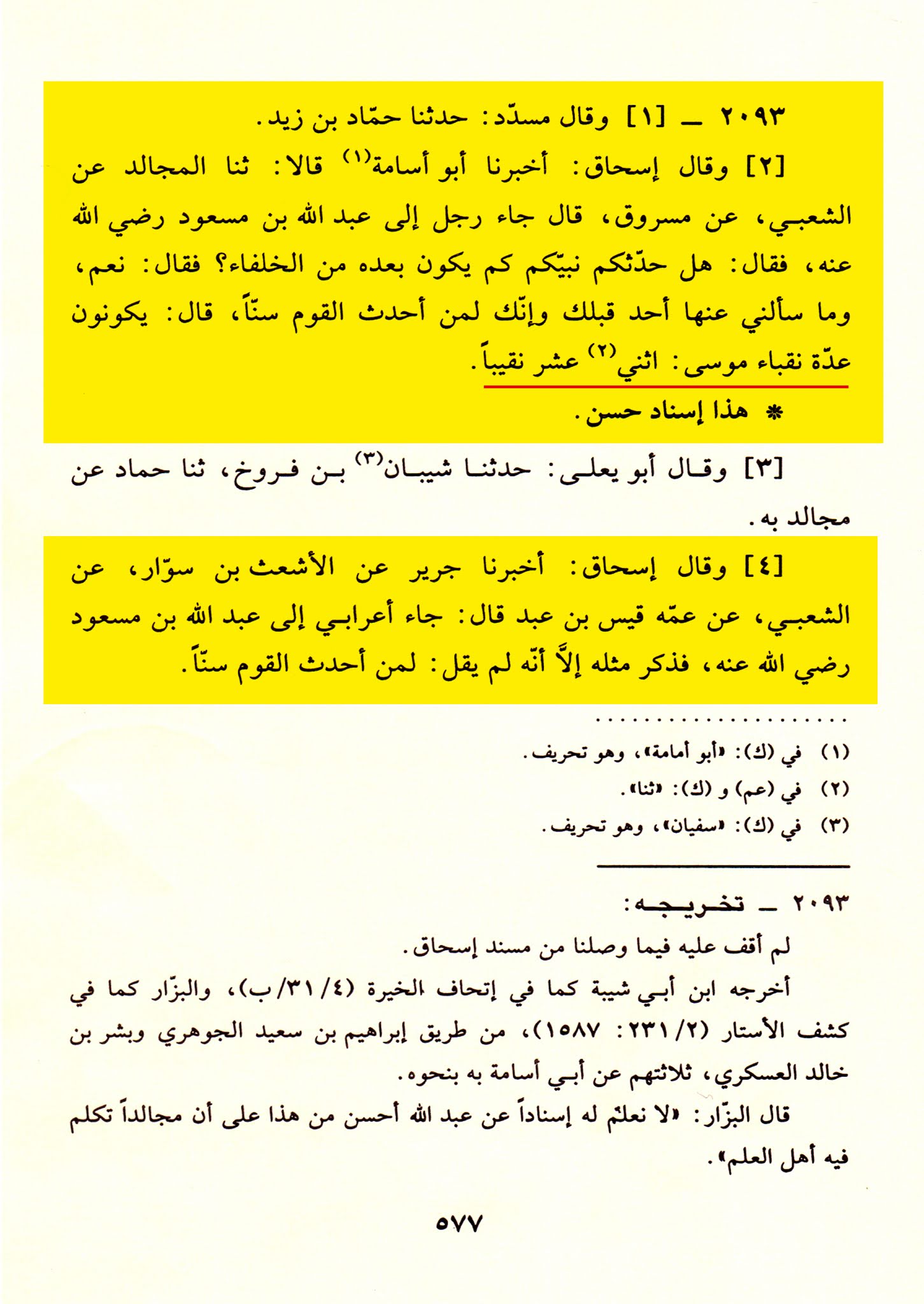 ونقله عن مسند إسحاق بن راهويه الحافظُ البوصيريّ في كتابه (إتحاف الخيرة المهرة بزوائد المسانيد العشرة)، قال: (قال مسدد: ثنا حماد، عن مجالد بن سعيد، ثنا الشعبي، عن مسروق قال: كنا جلوساً عند عبد الله بن مسعود بعد المغرب وهو يقرأ القرآنفسأله رجل: يا أبا عبد الرحمن، أما سألتَ النبي - صلى الله عليه وسلم - كم يملك هذه الأمة من خليفة؟ قال: ما سألني عنها أحد منذ قدمتُ العراق قبلك، قال: نعم، ولقد سألناه، فقال: اثنا عشر كعدة نقباء بني إسرائيل.