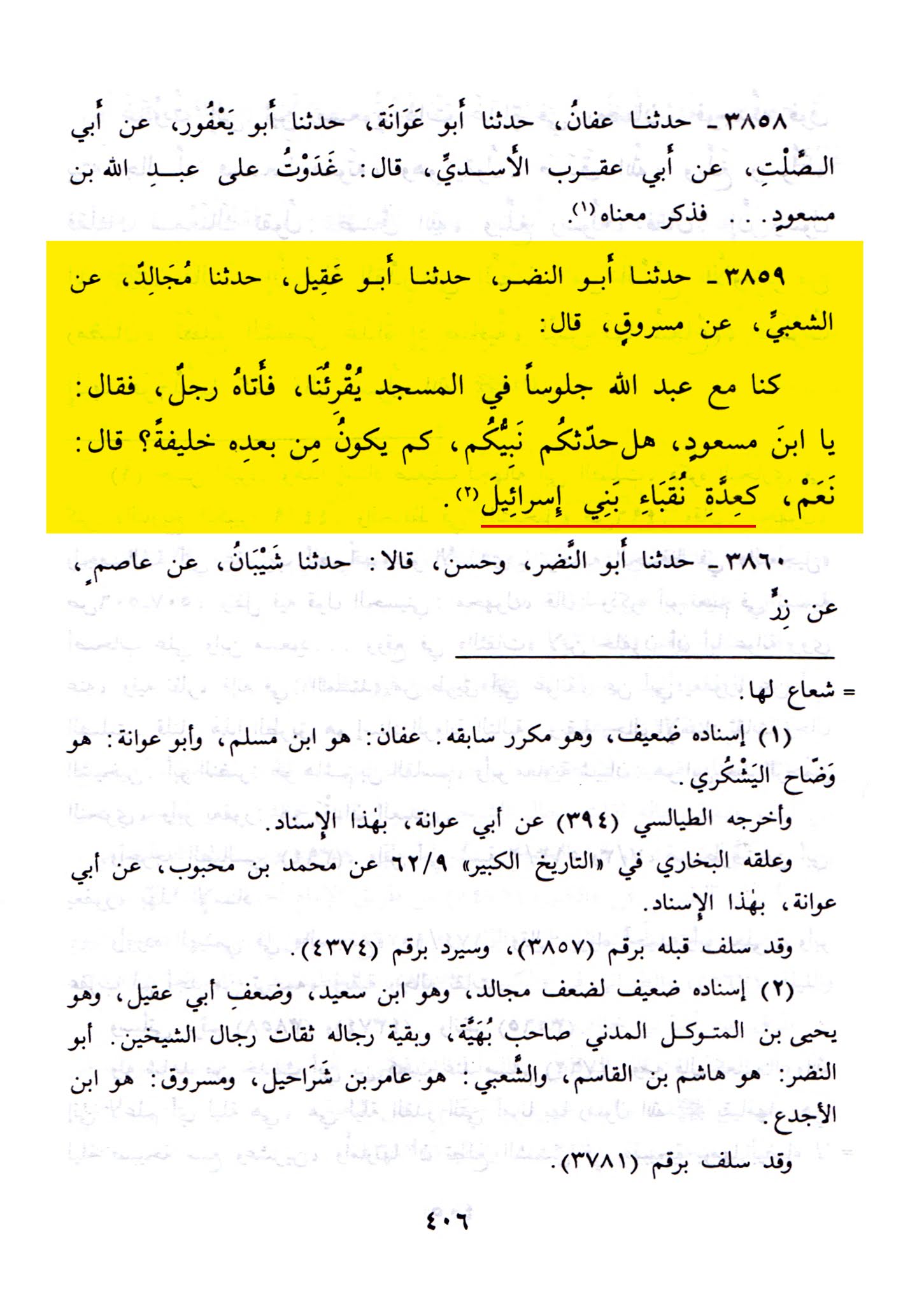 وروى أيضاً: (حدثنا أبو النضر، حدثنا أبو عقيل، حدثنا مجالد، عن الشعبي، عن مسروق، قال: كنا مع عبد الله جلوساً في المسجد يقرئنا، فأتاه رجل، فقال: يا ابن مسعود، هل حدَّثَكم نبيكم كم يكون من بعده خليفة؟ قال: نعم، كعدة نقباء بني إسرائيل).