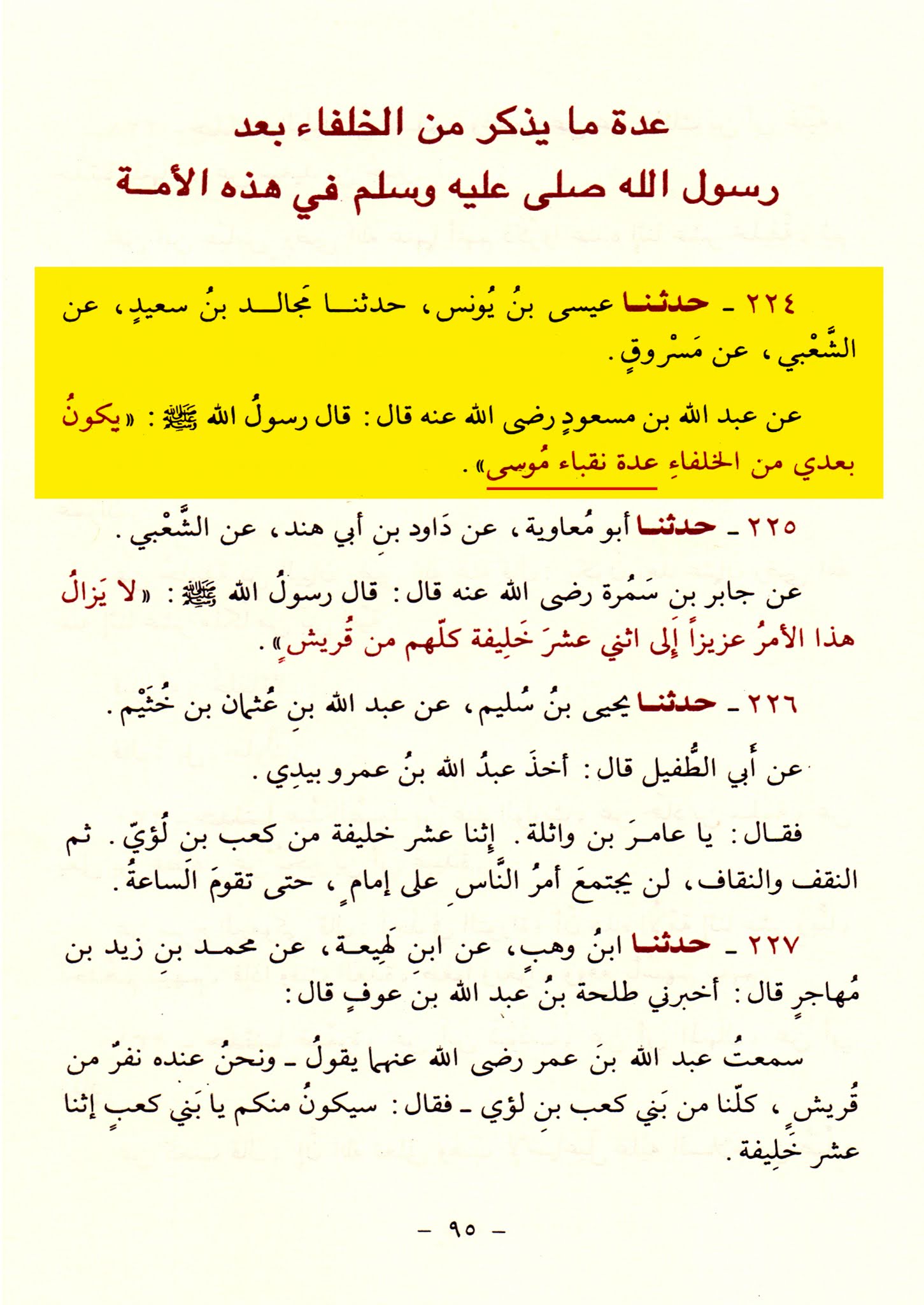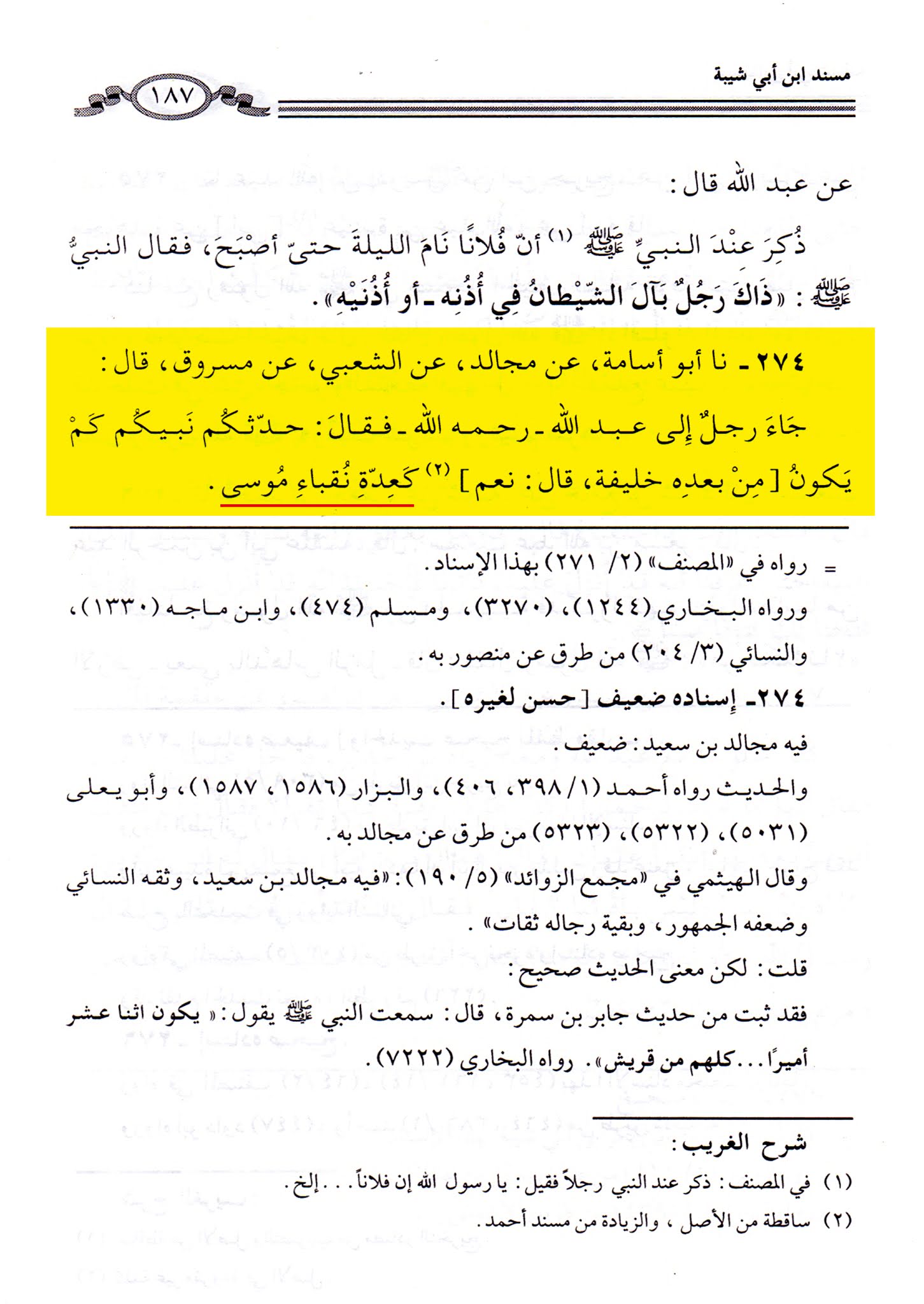 قال: (نا أبو أسامة، عن مجالد، عن الشعبي، عن مسروق، قال: جاء رجل إلى عبد الله - رحمه الله - فقال: حدثكم نبيكم كم يكون من بعده خليفة، قال: «نعم كعدة نقباء موسى»).