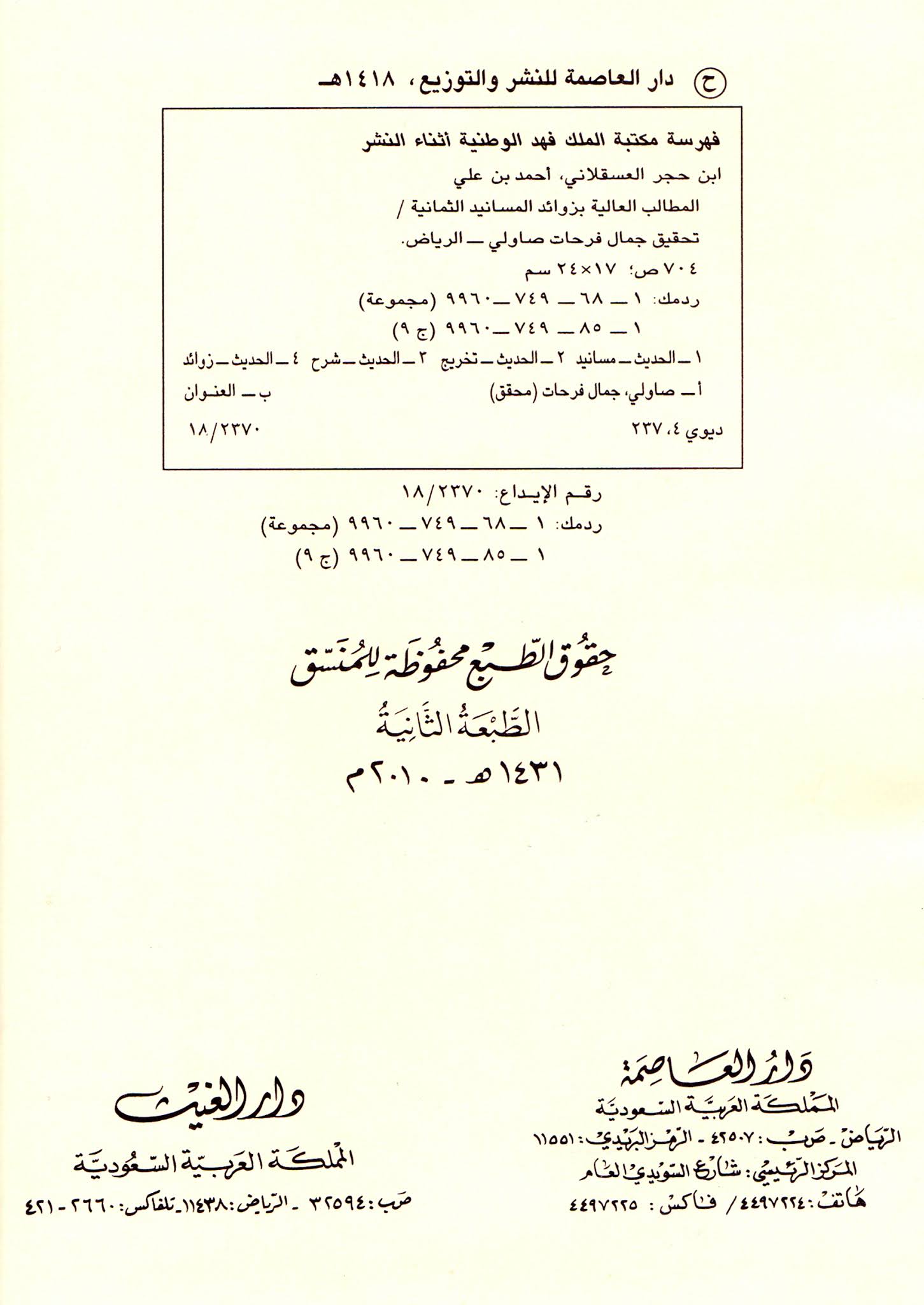 المصدر: المطالب العالية بزوائد المسانيد الثمانية، ج9، ص577، رقم الحديث 2093.