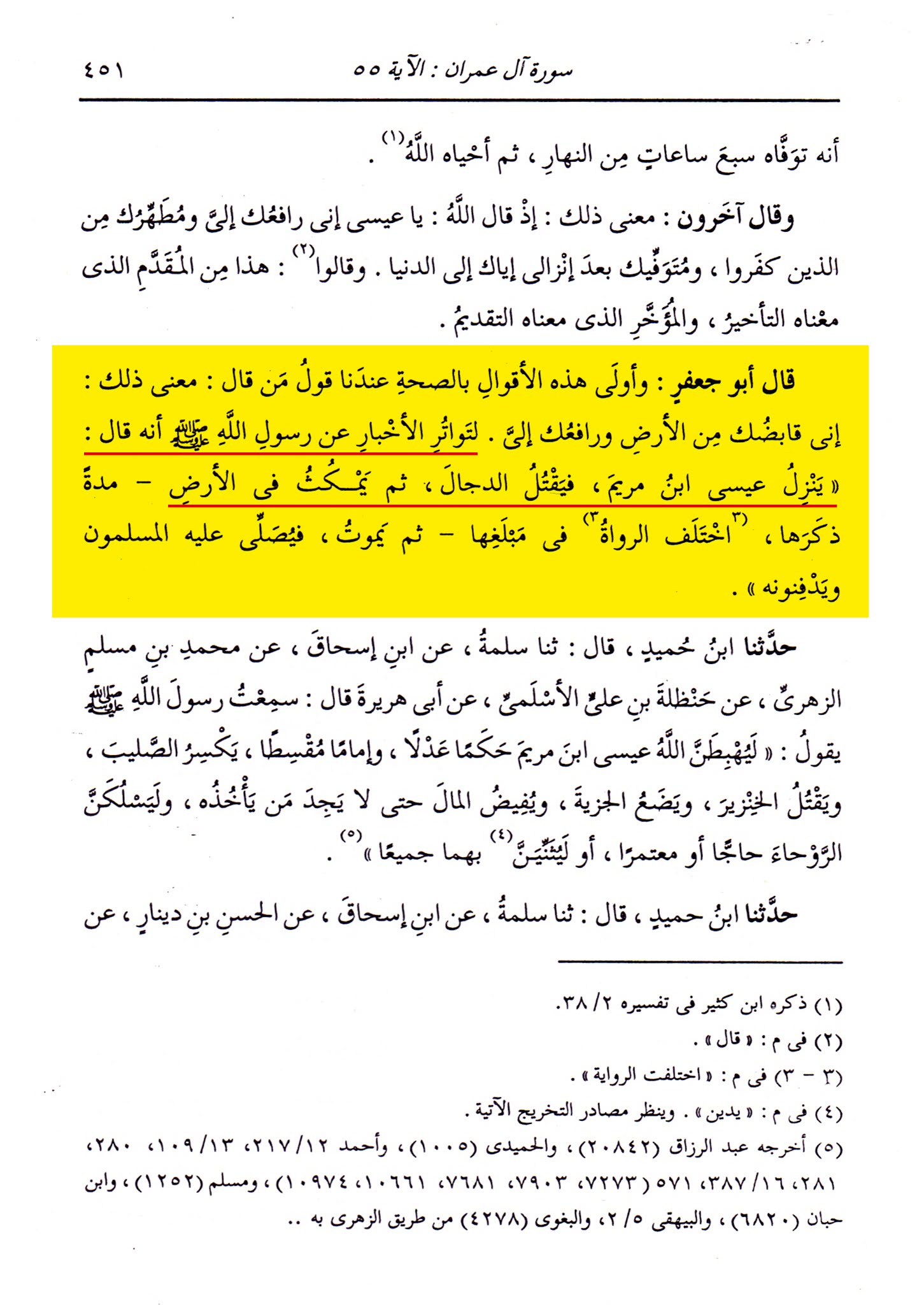 قال في تفسيره: (وأولى هذه الأقوال بالصحة عندنا قول من قال: معنى ذلك: إني قابضك من الأرض ورافعك إلي؛ لتواتر الأخبار عن رسول الله صلى الله عليه وسلم أنه قال: «ينزل عيسى ابن مريم فيقتل الدجال» ثم يمكث في الأرض - مدة ذكرها اختلف الرواة في مبلغها -، ثم يموت، فيصلي عليه المسلمون ويدفنونه).