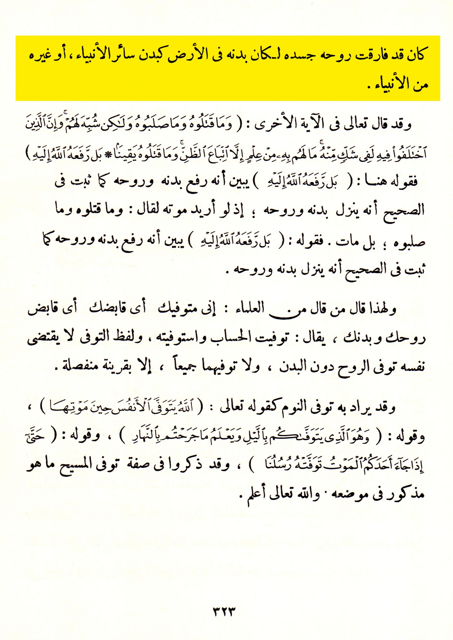 قال: (عيسى عليه السلام حي وقد ثبت في الصحيح عن النبي صلى الله عليه وسلم أنه قال: "ينزل فيكم ابن مريم حكماً عدلاً وإماماً مقسطاً فيكسر الصليب ويقتل الخنزير ويضع الجزية"، وثبت في الصحيح عنه أنه ينزل على المنارة البيضاء شرقي دمشق وأنه يقتل الدجال. ومَنْ فارقت روحُه جسدَه لم ينزل جسده من السماء وإذا أُحيي فإنه يقوم من قبره. وأما قوله تعالى: (إني متوفيك ورافعك إلي ومطهرك من الذين كفروا) فهذا دليلٌ على أنه لم يعنِ بذلك الموت؛ إذ لو أراد بذلك الموت لكان عيسى في ذلك كسائر المؤمنين؛ فإن الله يقبض أرواحهم ويعرج بها إلى السماء فعلم أن ليس في ذلك خاصية. وكذلك قوله: (ومطهرك من الذين كفروا) ولو كان قد فارقت روحه جسده لكان بدنه في الأرض كبدن سائر الأنبياء أو غيره من الأنبياء).
