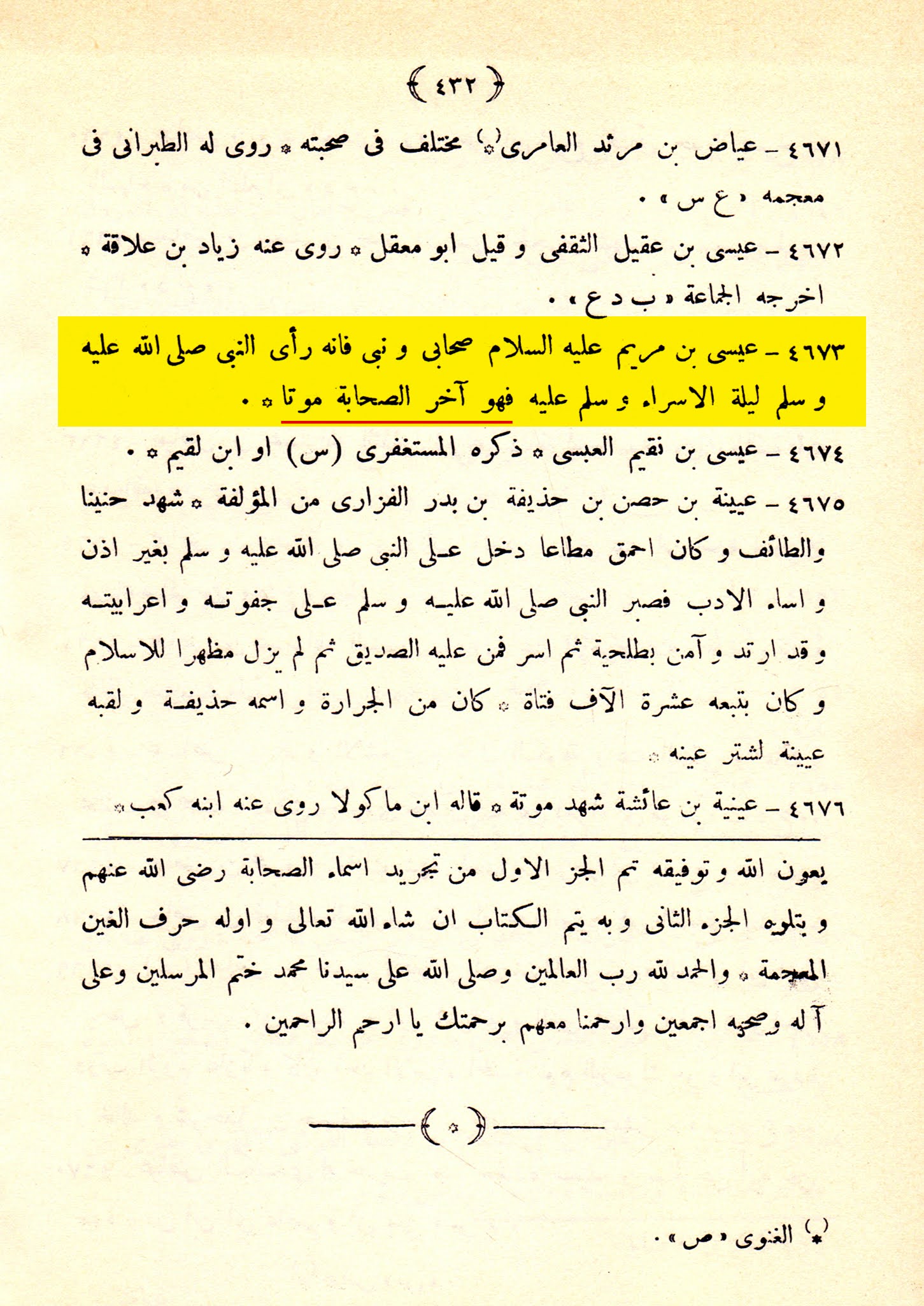 قال في تِعداد صحابة رسول الله -صلّى الله عليه وآله-: (عيسى بن مريم عليه السلام: صحابيٌّ ونبيٌّ؛ فإنّه رأى النبيَّ صلى الله عليه وسلّم ليلة الإسراء وسلّم عليه، فهو آخرُ الصّحابةِ موتاً).