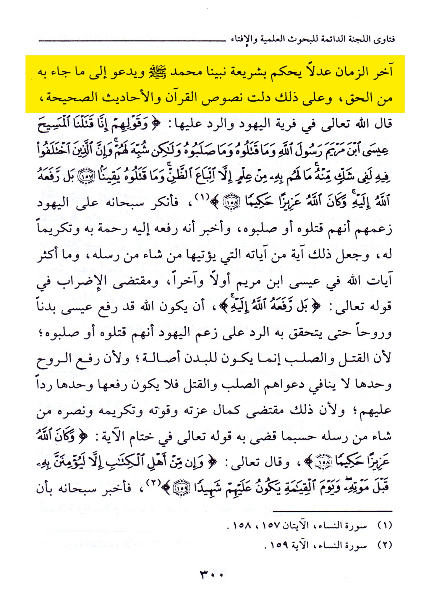قال: (وهذا هو المقصود من السياق الإخبار بحياته الآن في السماء، وليس الأمر كما يزعمه أهل الكتاب الجهلة أنهم صلبوه بل رفعه الله إليه، ثم ينزل من السماء قبل يوم القيامة، كما دلت عليه الأحاديث المتواترة كما سبق في أحاديث الدجال، وكما سيأتي أيضا، وبالله المستعان).