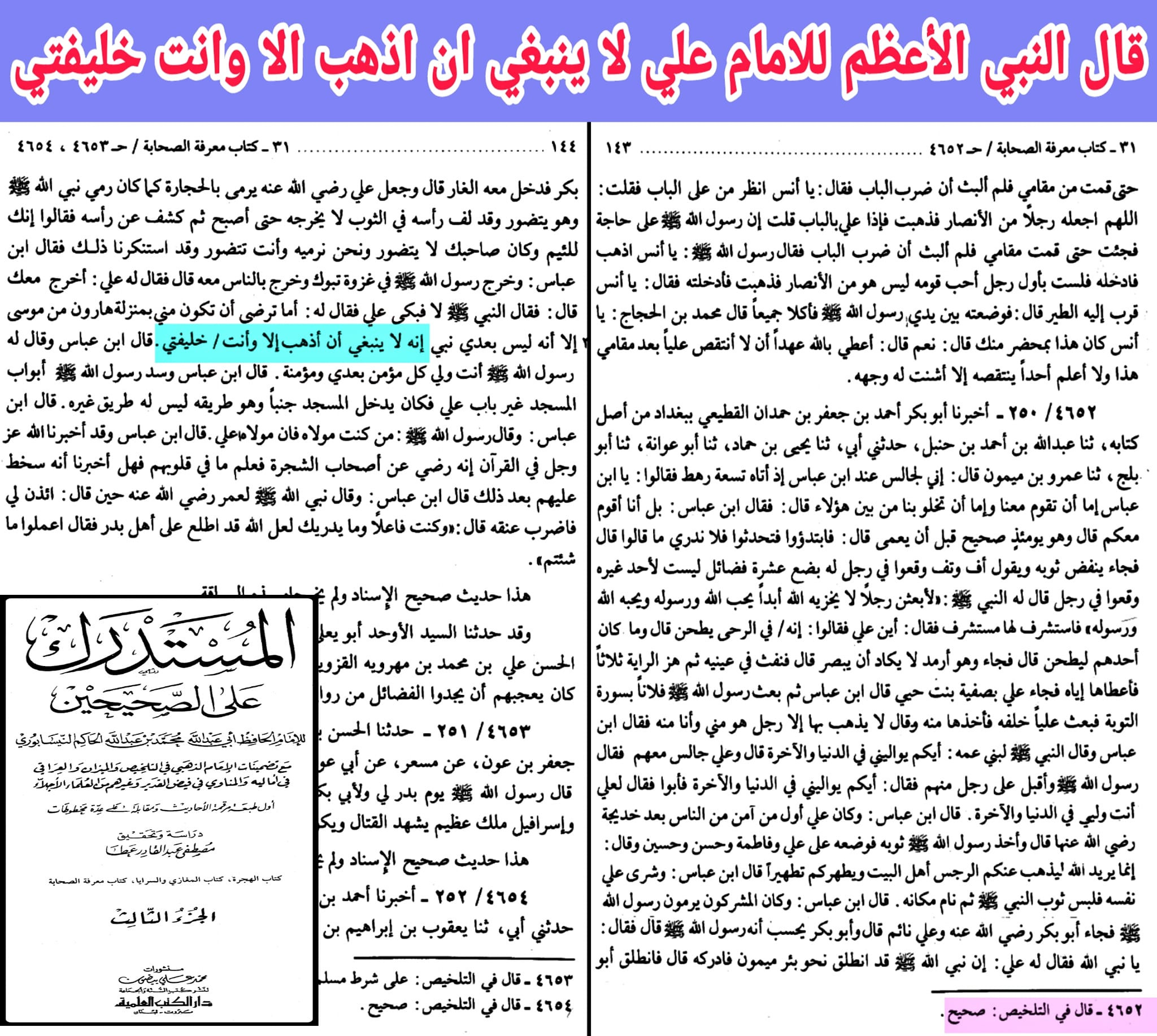 وحديث من كنت مولاه. روى الإمام أحمد. أنه سمعه من النبي صلى الله عليه وآله وسلم ثلاثون صحابيا. شهدوا به لعلي بن أبي طالب مما توزع أيام خلافته. وصرح بتواتر هذا الحديث العديد من العلماء. قاله المناوي في التيسير نقلا عن السيوطي وشارح المواهب اللدنية. وفي الصفوة للمناوي قال ابن حجر. حديث من كنت مولاه. " أخرجه الترمذي والنسائي. وهو كثير الطرق جدا وقد استوعبها ابن عقدة في مؤلف مفرد وأكثر أسانيدها صحيح أو حسن " . وكما أن حديث من كنت مولاه يحدد مكان علي بن أبي طالب داخل دائرة الأمة. فإن قول النبي صلى الله عليه وآله وسلم له: " أما ترضى أن تكون مني بمنزلة هارون من موسى إلا أنه لا نبي بعدي " . وفي رواية عند الإمام أحمد " أما ترضى أن تكون مني بمنزلة هارون من موسى إلا أنك لست ببني. أنه لا ينبغي أن أذهب إلا وأنت خليفتي " وفي رواية عند ابن أبي عاصم: " أنه لا ينبغي أن أذهب إلا وأنت خليفتي في كل مؤمن بعدي "