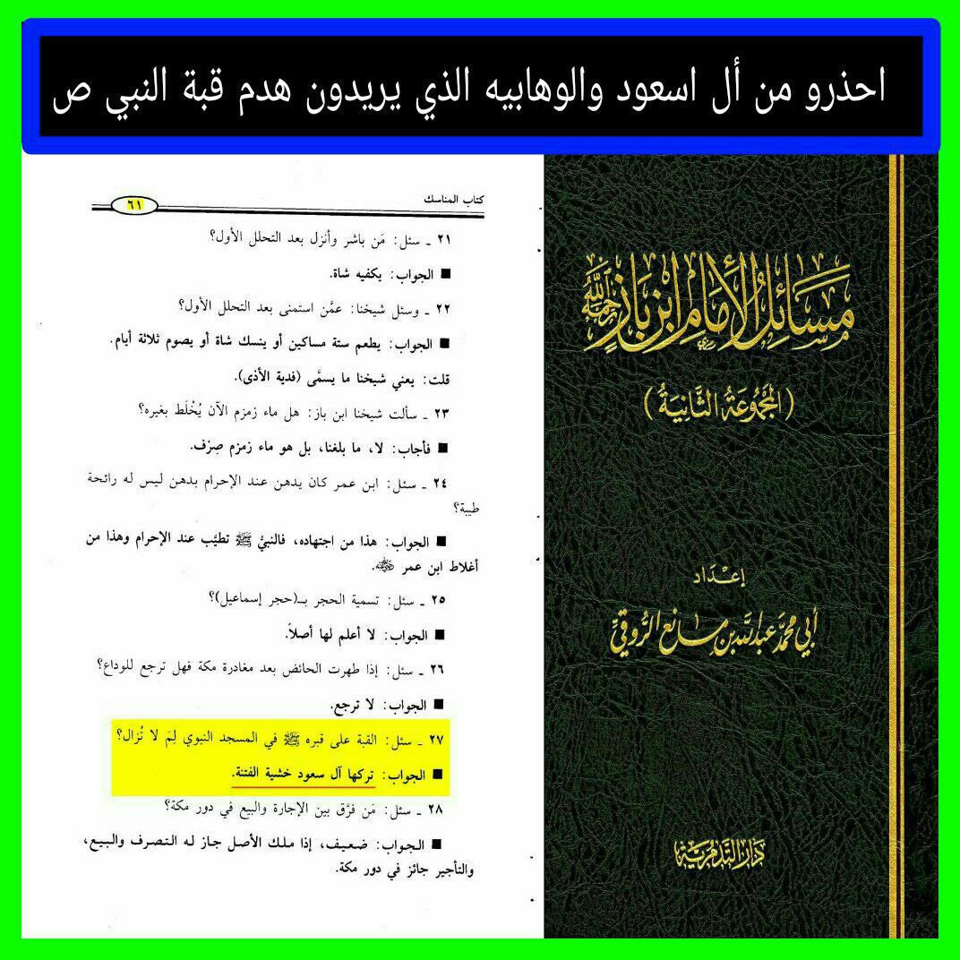 باعتراف ابن باز (آل سعود تركوا هدم قبة النبي - ص - خشية من الفتنة) .