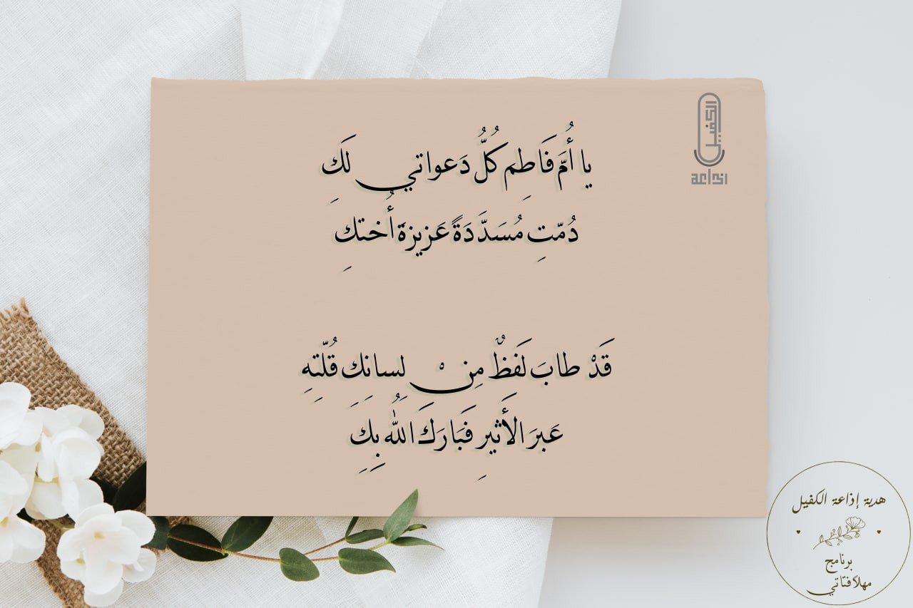 ٢) إهداء وكتابة بيتين من الشعر الفصيح يُذكرُ خلالهما إسم الفائزة، ثم يُصممُ ذلك في لوحة ليتم نشرها هنا على صفحة الفيس بوك الخاص بالإذاعة، وعلى صفحة منتدى الكفيل قسم برامج الإذاعة..