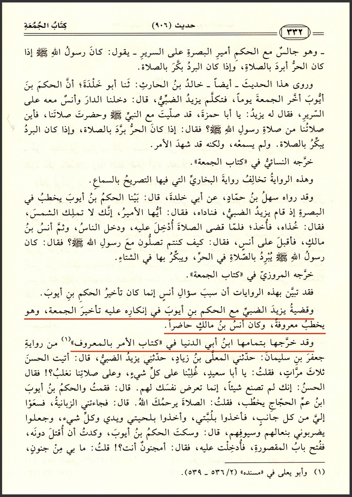 ولهذا لم يستطع أنس أن يجيب يزيد الضبي بشيءٍ حين تكلم يزيد، وإنما قال للحكم لما سأله: قد بقي من الشمس بقيةٌ – يريد: قد بقي من ميقات العصر بقيةٌ -، وهو كما قال لكن وقت الجمعة كان قد فات، ولم يستطع أن يتكلم بذلك، فلما دخل الحكم داره، وأدخل معه أنساً ويزيد الضبي، فسئل أنس في ذلك الوقت عن وقت صلاة النبي – صلى الله عليه وسلم -، فأخبر أنه كان يعجل في البرد، ويبرد في الحر، ومراده -والله أعلم-: صلاة الظهر، وهذا هو الذي أمكن أنساً أن يقوله في ذلك الوقت، ولم يمكنه الزيادة على ذلك.