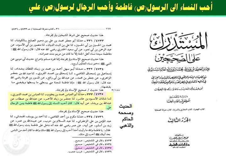 لكن حينما نرجع الى مصادرهم الصحيحة فنجد خلاف مايزعمون ؟ حيث تروي مصادرهم الصحيحة ان احب الرجال الى رسول الله (صلى الله عليه واله) هو علي بن ابي طالب ومن النساء فاطمة الزهراء وهذا مشهور وواضح بدليل هذه الوثيقة .