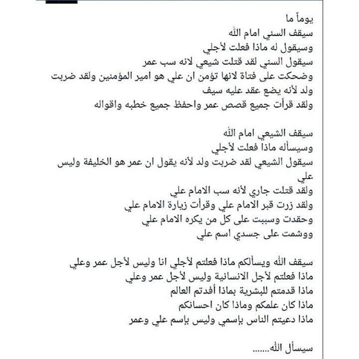 الامر ليس كذلك تماماً، فان الانسان المؤمن لا يسأل عن هذه الاشياء فقط، انما هنالك منظومة متكاملة وشريط يعاد على الانسان ويسأل عن كل شيء، ولا يمكن ان يكون دين الانسان المسلم الشيعي بهذه الاسئلة التي ذكرت وليس بهذا المستوى انما هنالك رفيع الدرجات وهنالك متسافل الدرجات، فلا يمكن ان نوجه الخطاب بالعموم للناس بهذه الصيغة، فان الكلام اعلاه مجرد جمل لا معنى لها، ومثل هذه الكلمات رائجة بشكل كبير هذه الايام وليس الهدف منها اصلاح الناس، ثم ان هذه الجمل اعلاه تبتني على مخالفات واضحة، منها ان الله لا يسئلنا عن علي، وهل علي بن ابي طالب شخص اعتيادي، ام هو امام، اليس الحديث المشهور من مات ولم يعرف امام زمانه مات ميتة جاهلية، الم ترد عند الشيعة نصوص تقول اول ما يسأل عنه المرء هو ولاية أهل البيت، وغير ذلك ، النتيجة ان كاتب هذه السطور لم يعرف العقيدة لا من جهة السنة ولا من الشيعة، فان الانسان العارف بالعقيدة والدين بشكل دقيق لا يتكلم بهذه الكلمات.